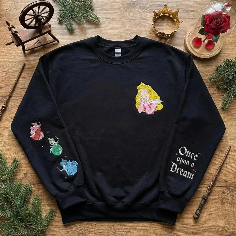 Sleeping Beauty Aurora Embroidered Crewneck, Once Upon A Dream Apparel, 2026 Flora Fauna Merryweather Movie Fan Gift