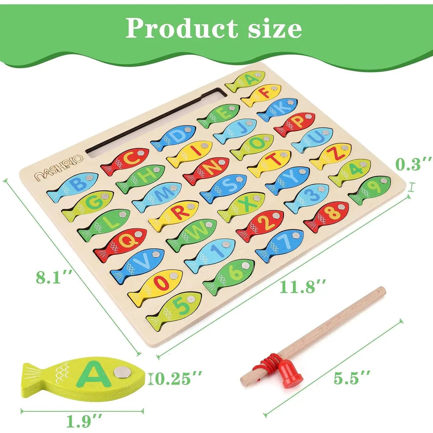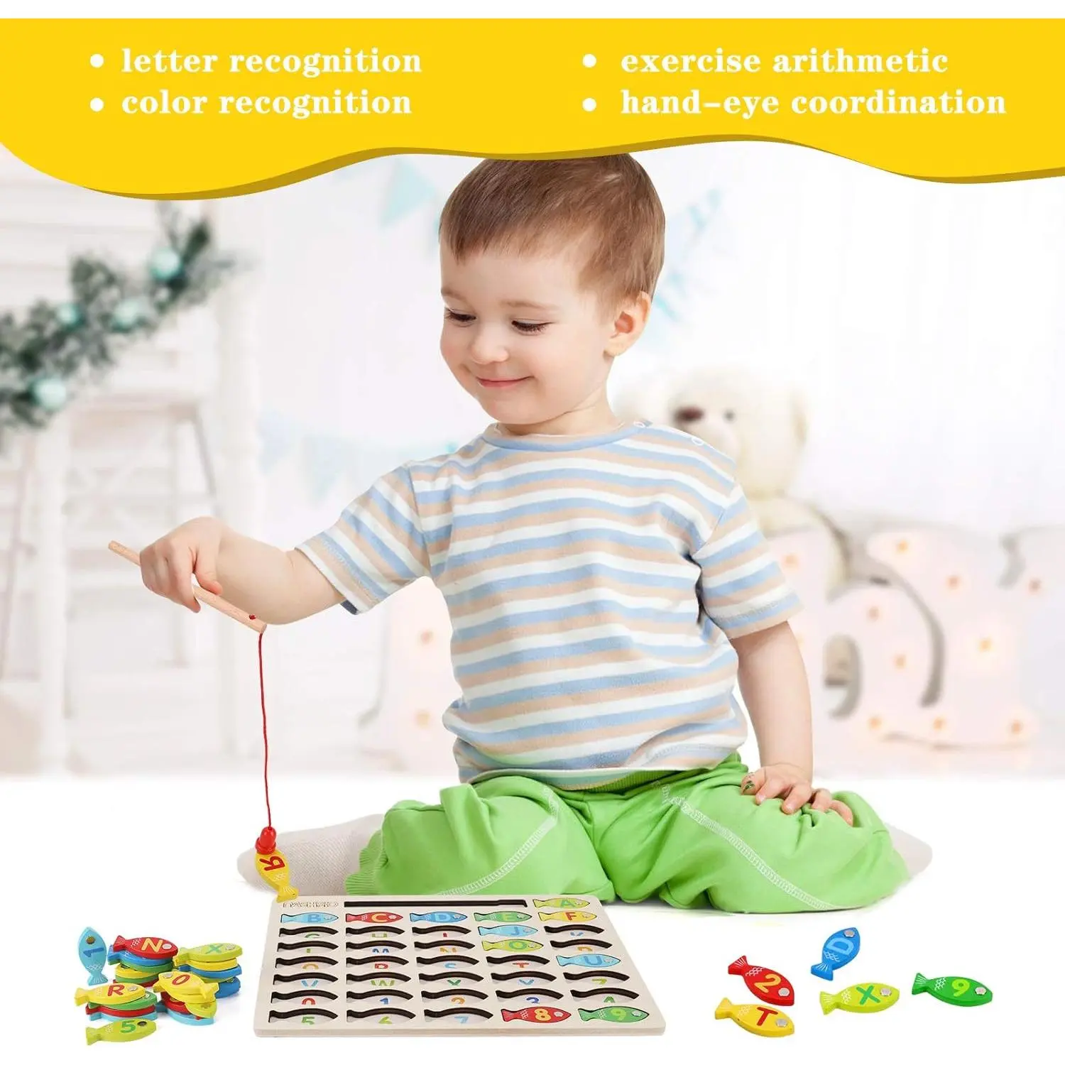 Magnetic Wooden Fishing Game Toy for Toddlers, Alphabet Fish Catching Counting Games Puzzle with Numbers and Letters, Preschool Learning ABC Math Educational Toys 3 4 5 Years Old Girl Boy Kids