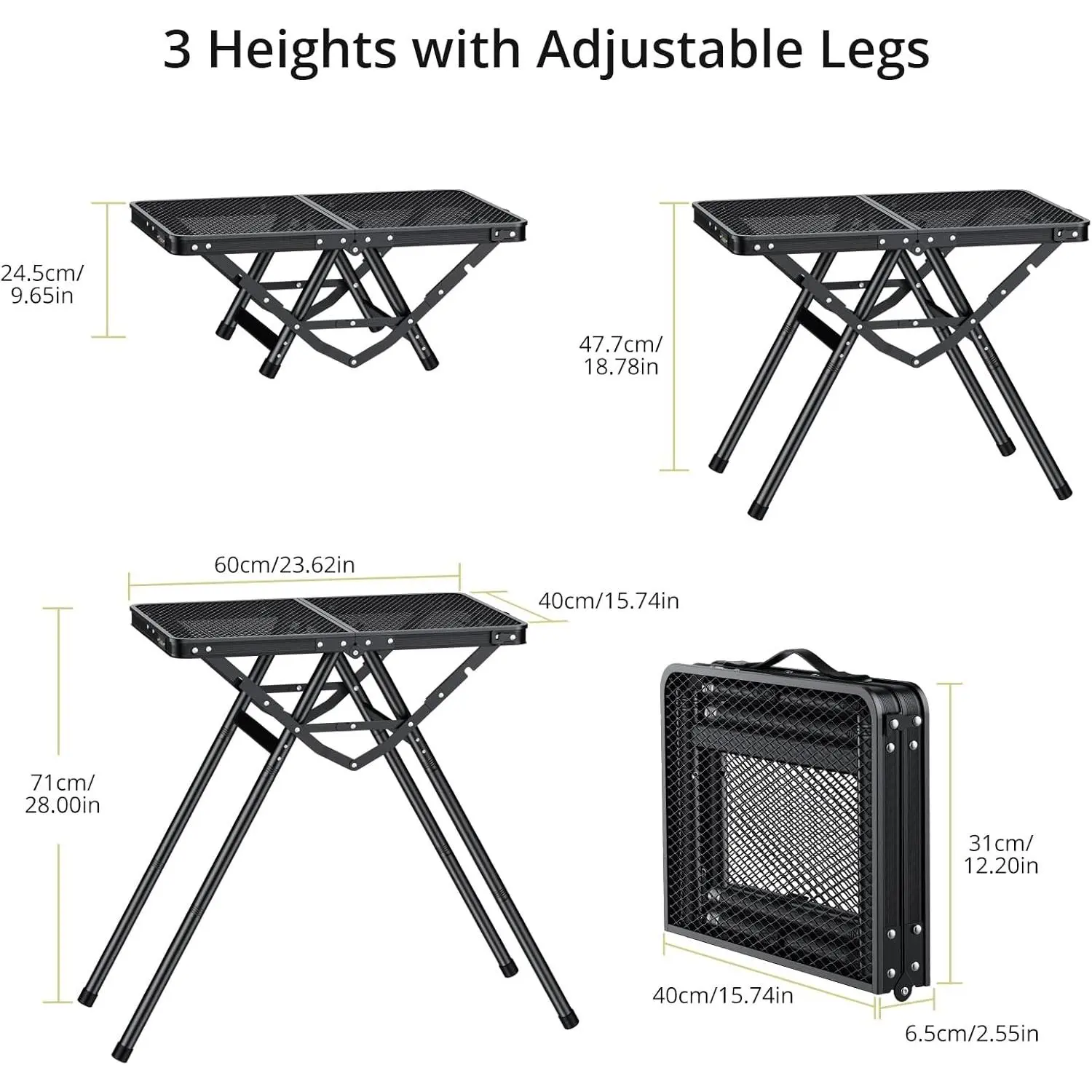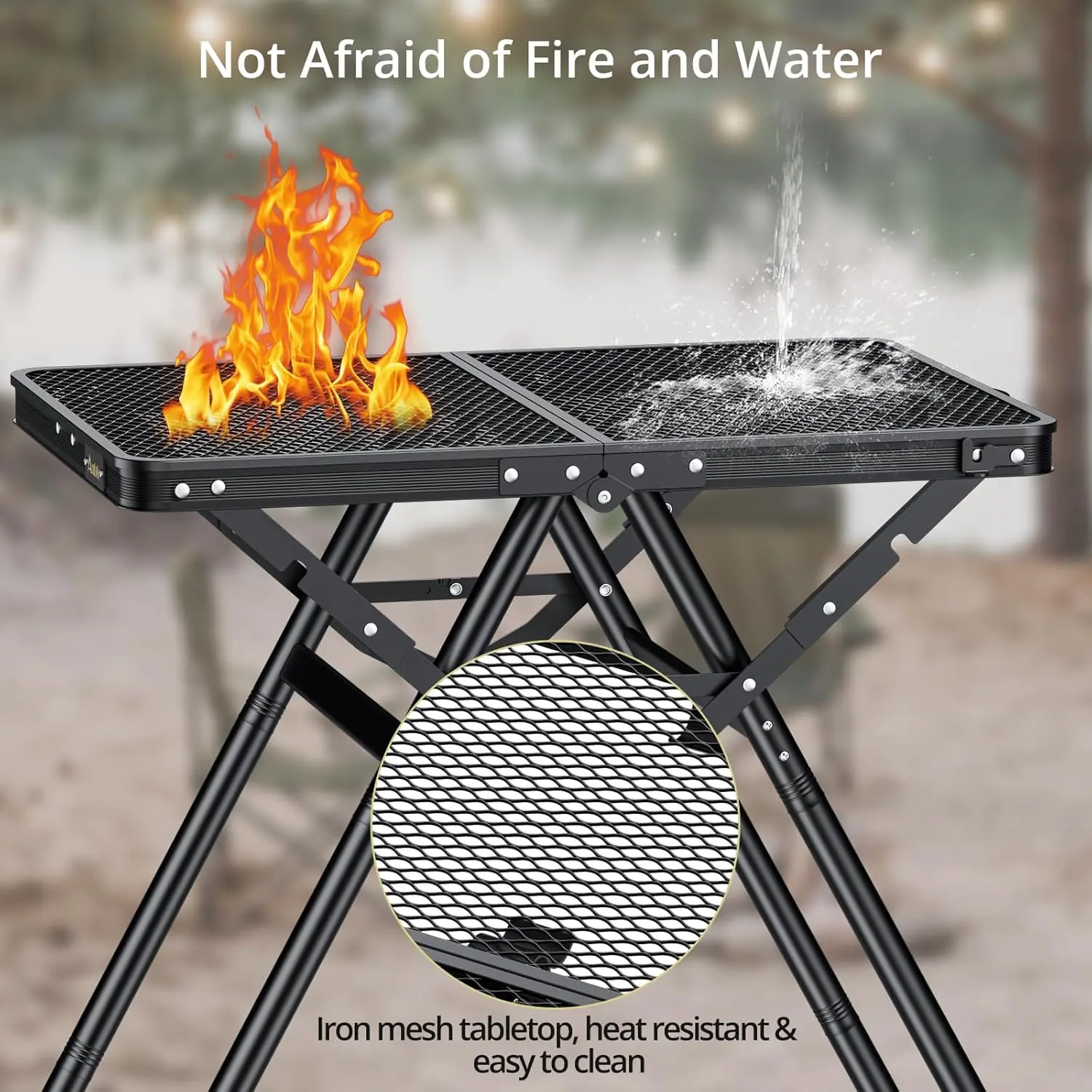 This portable folding table frame is made of aluminum alloy, making it very lightweight. The tabletop is an upgraded iron mesh tabletop that is heat resistant, making it ideal for placing a barbecue grill on top.