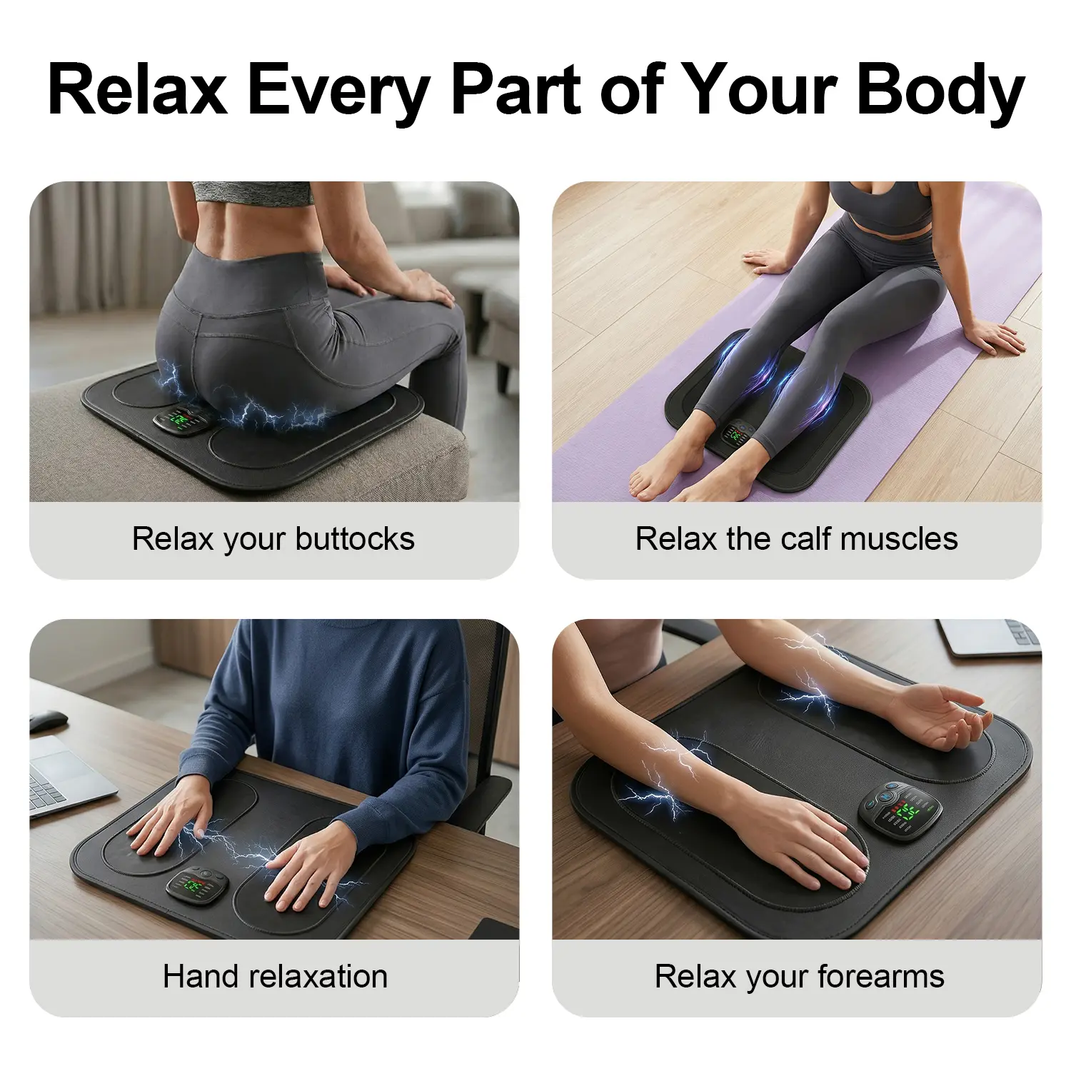 Adopting advanced EMS technology, this foot massager pad sends low-frequency pulse currents to stimulate the foot muscles, effectively promoting blood circulation, relieving muscle tension, and reducing foot pain and swelling. It is an ideal solution for people who stand for long hours, have poor circulation, or suffer from plantar fasciitis.