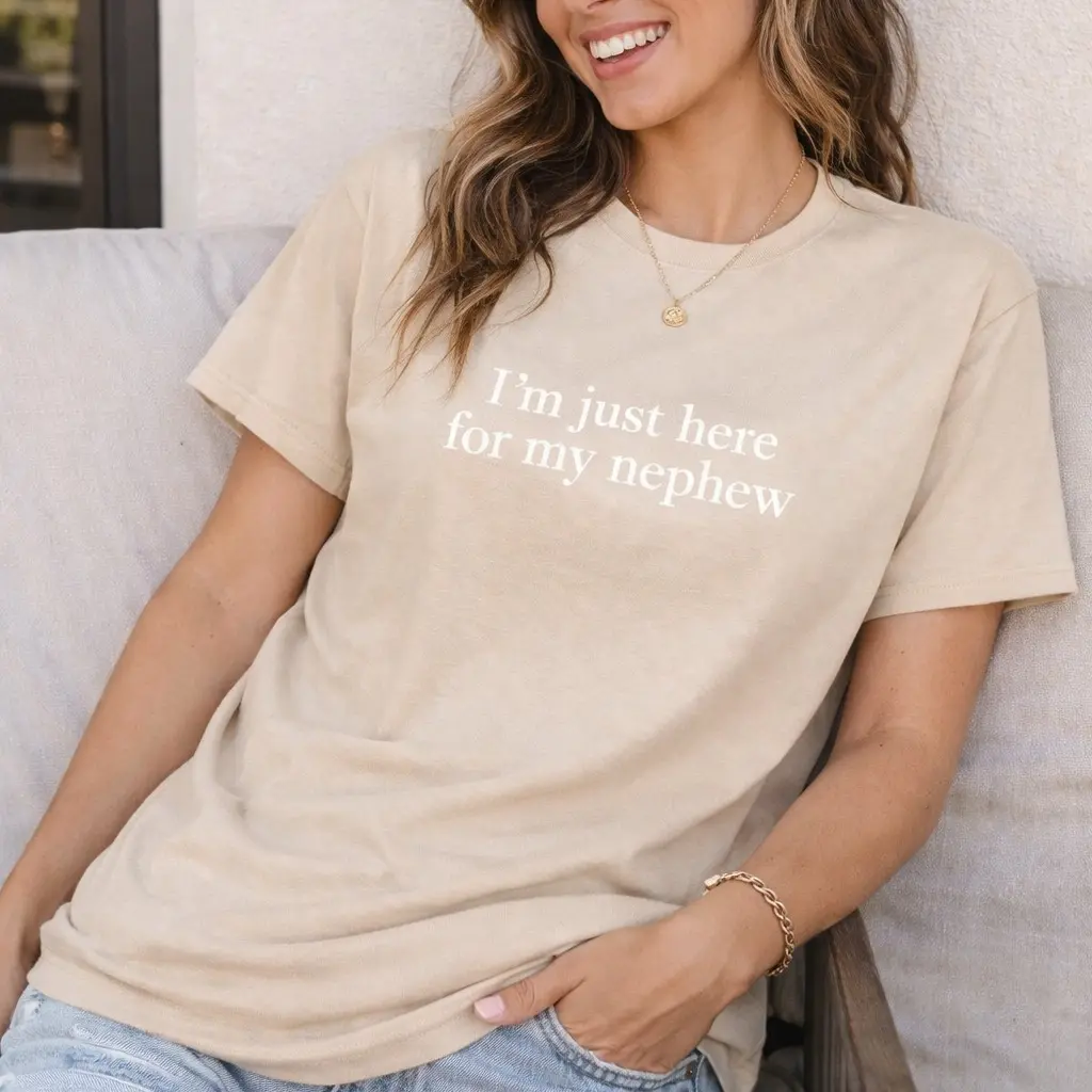 This playful and heartwarming t-shirt features the charming phrase “I’m just here for my nephew” in a soft, minimalist white font against a classic heather gray backdrop. The clean, understated design keeps it effortlessly stylish while delivering a fun, proud-aunt vibe that’s perfect for casual outings, family gatherings, or showing off that special bond. It’s a must-have for any aunt who knows exactly who the real star is.