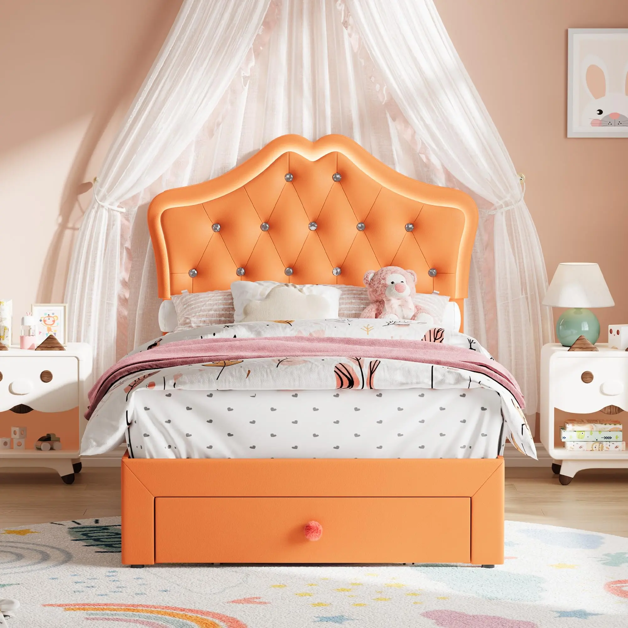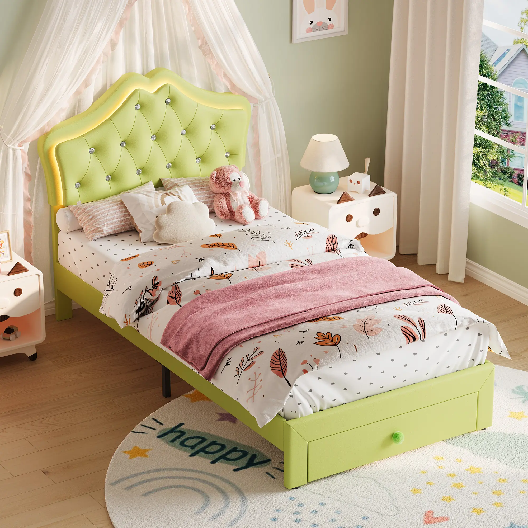 Twin Size Bed Frame with LED Lights & Velvet Crystal Button Headboard – Upholstered Platform Bed with Storage Drawer, Noise Free, No Box Spring Needed for Kids & Teens
