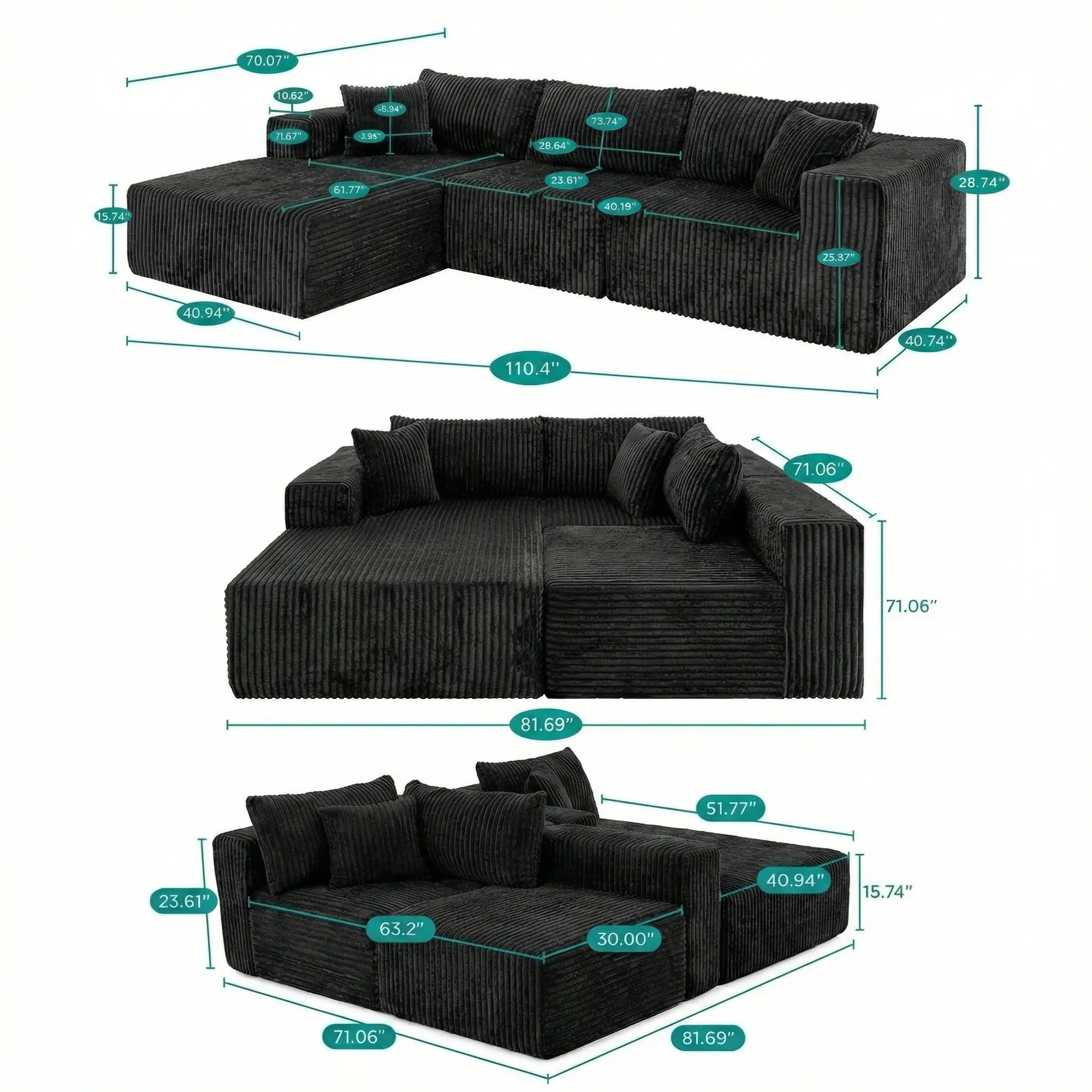 ·Oversized Deep Seating for Real Relaxation: Low-profile lounge design with a spacious 110" frame, 51" chaise depth, and extra-deep 30" seats; sit closer to the ground for that true cloud couch sink-in feel — ideal for lounging, napping, or movie nights