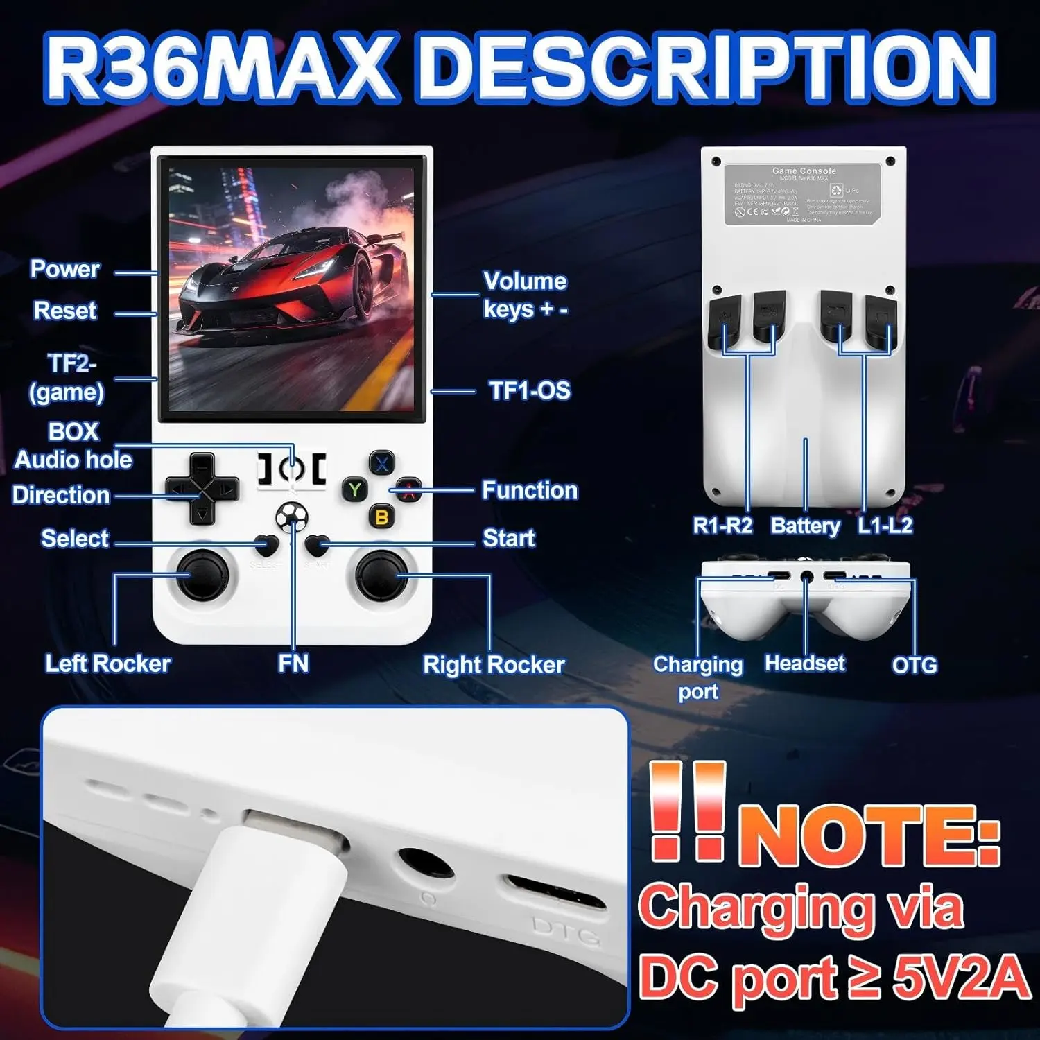 ·Note: 1. For your handheld game console to charge efficiently, we recommend using a charger with an output of at least 5V/2A (10W) or higher. Please ensure that you charge the device through the DC port 2. When you receive your console, the TF card will be inserted inside the game console