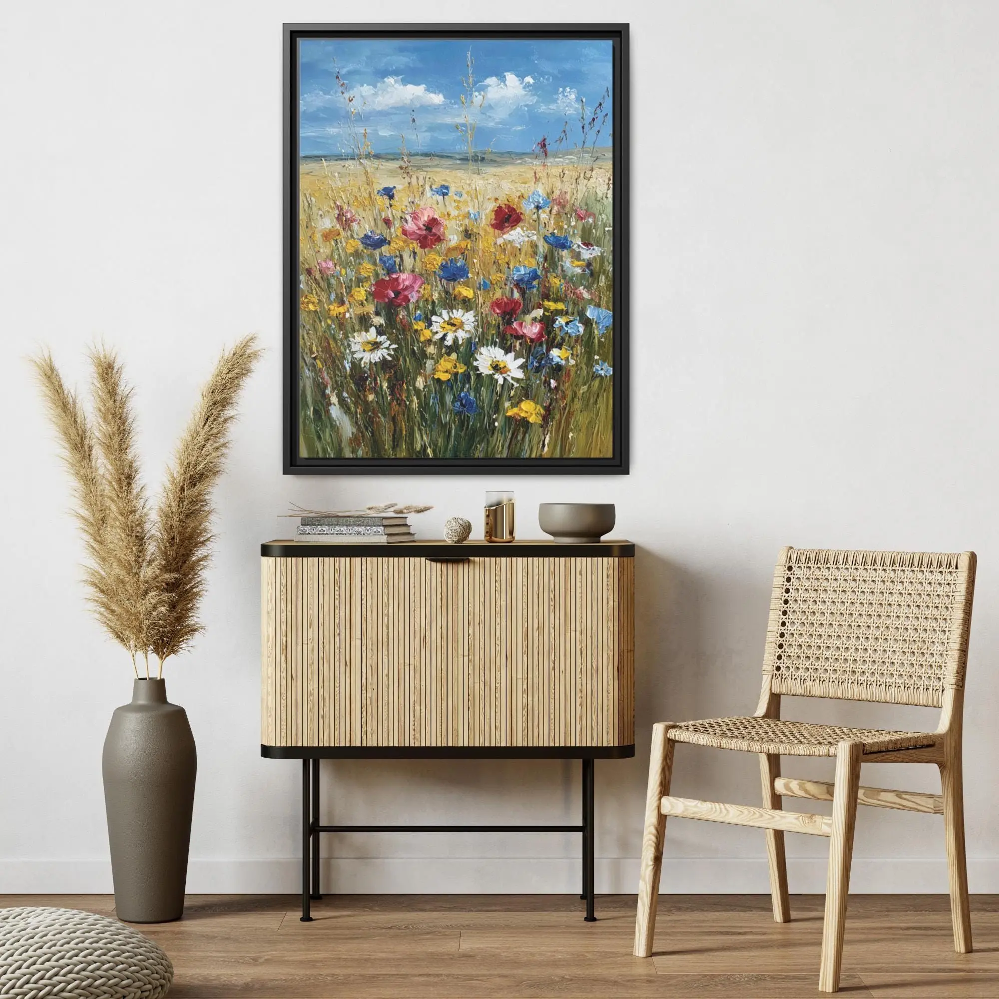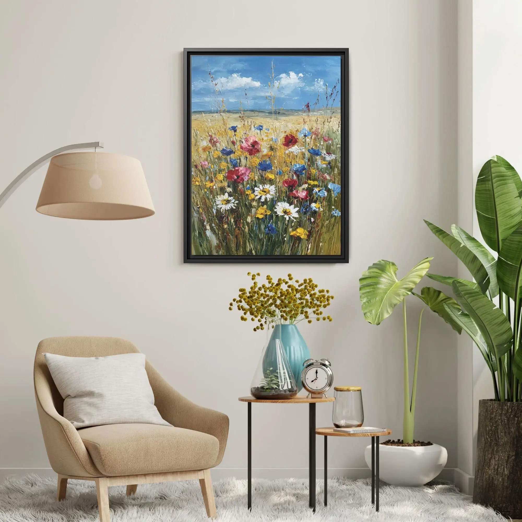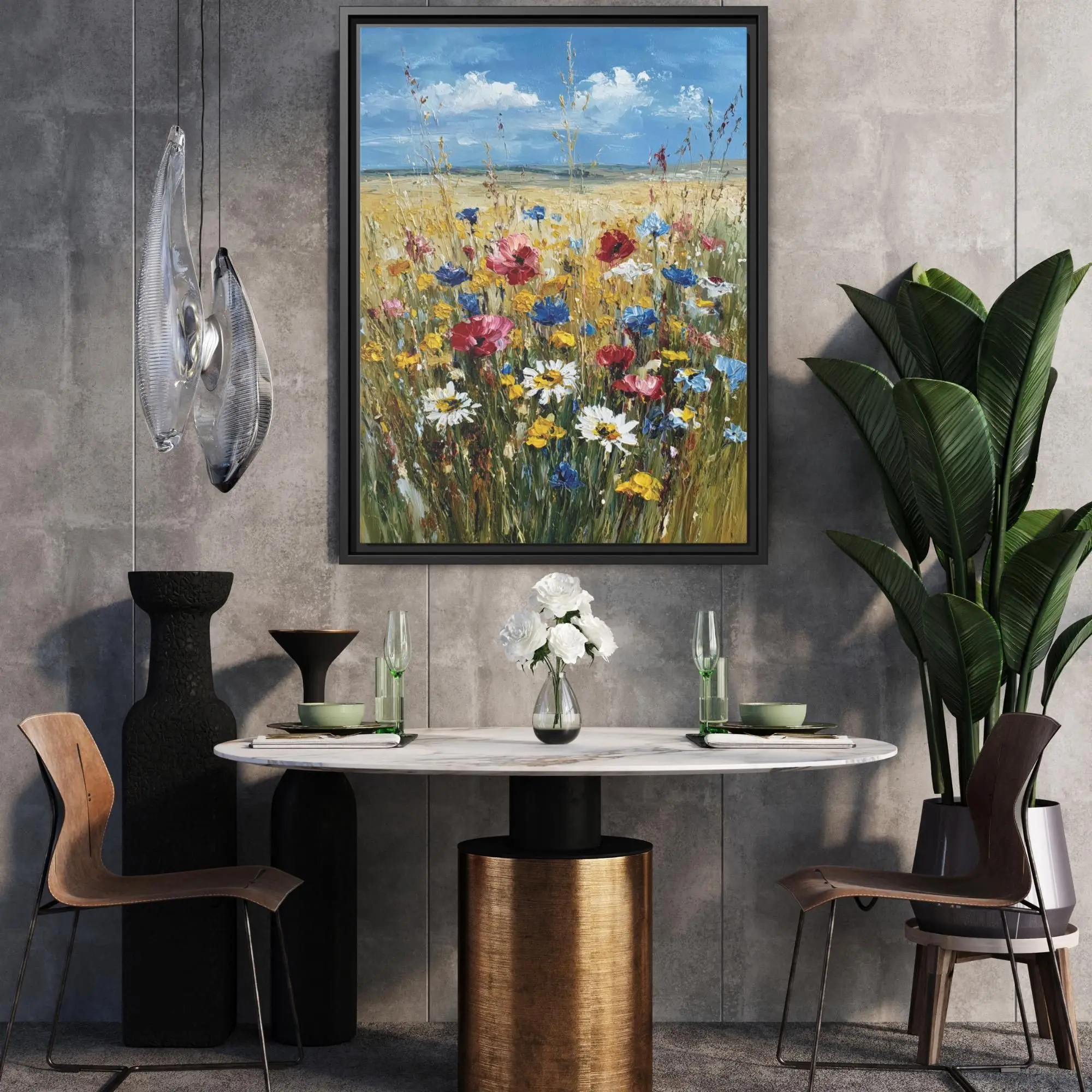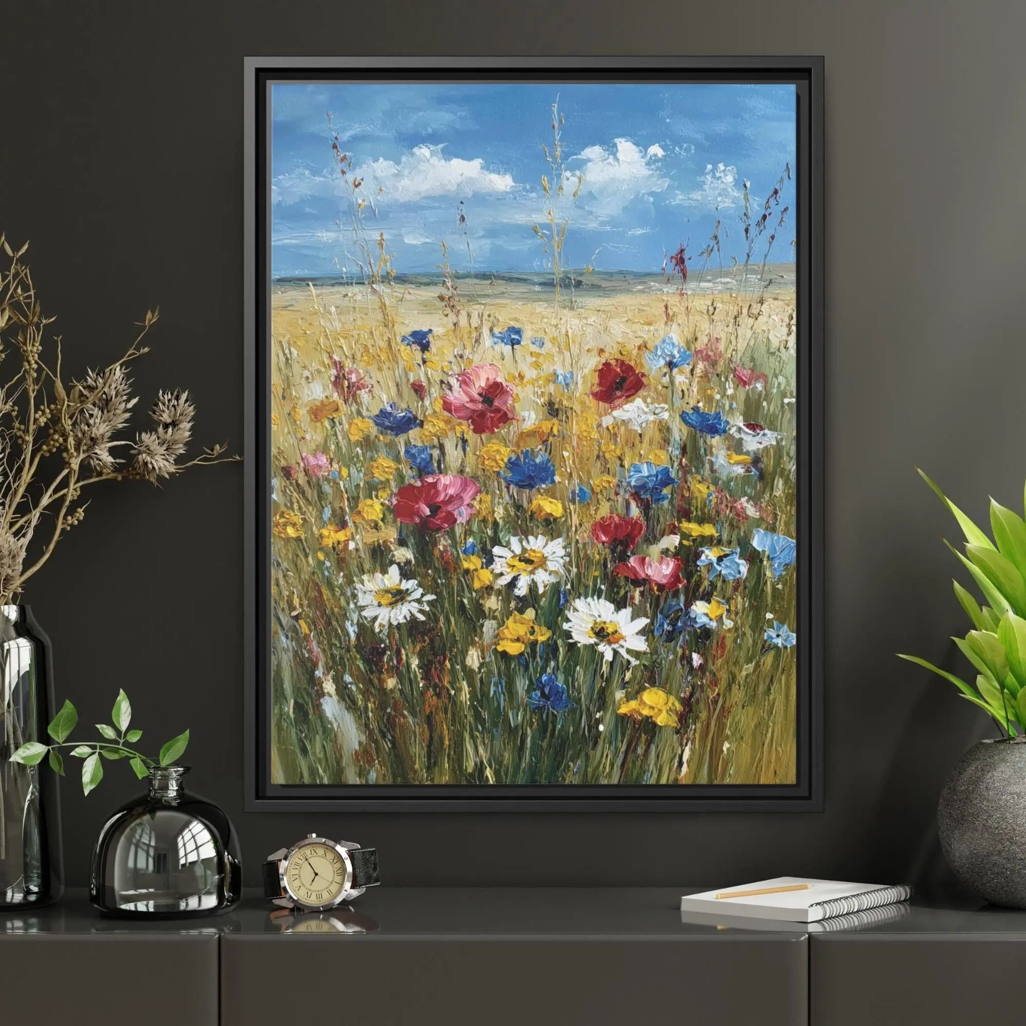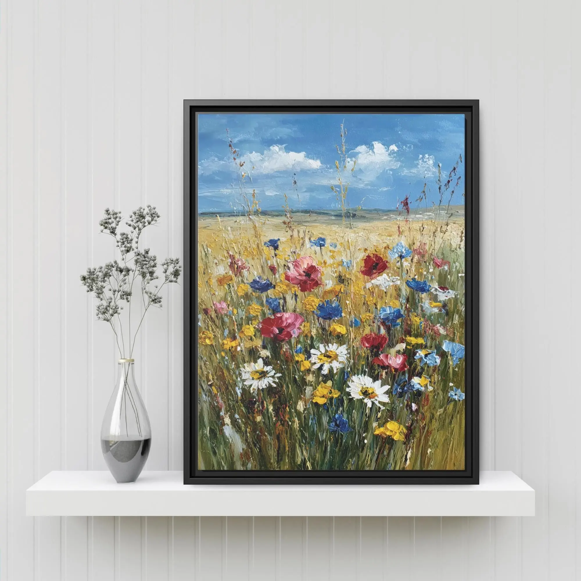 [Sale off up to 40%] [Frame Canvas] Spring Wildflower Meadow Art, Blue Sky Impasto Oil Painting Print, Large Farmhouse Botanical Decor, Thick Floral Meadow Canvas