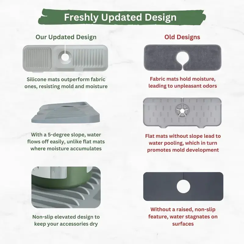 • The longer silicone faucet guard offers additional protection. It also functions as a draining mat, helping to prevent water pooling around the faucet. This mat is an essential addition to any kitchen setup, enhancing functionality and aesthetics.