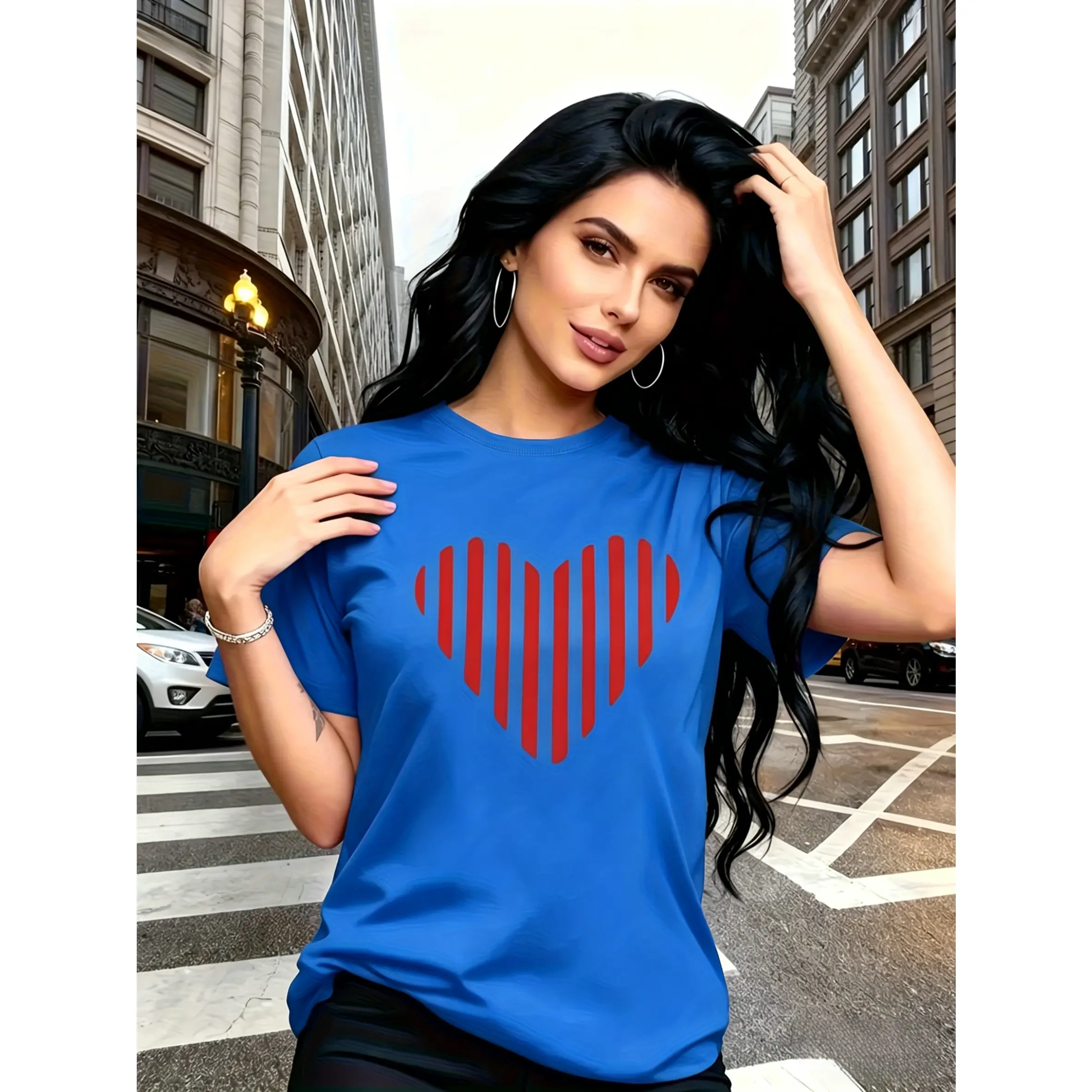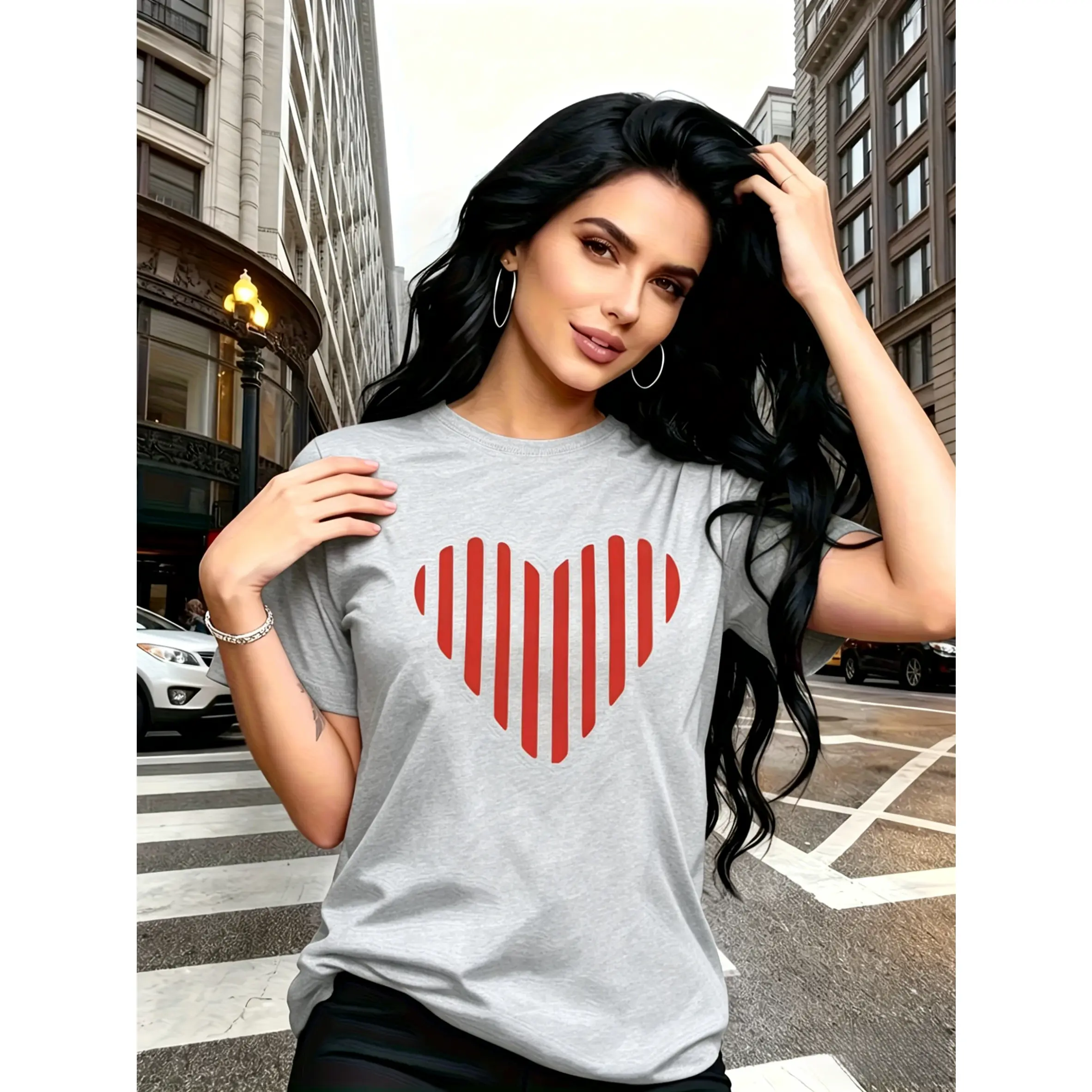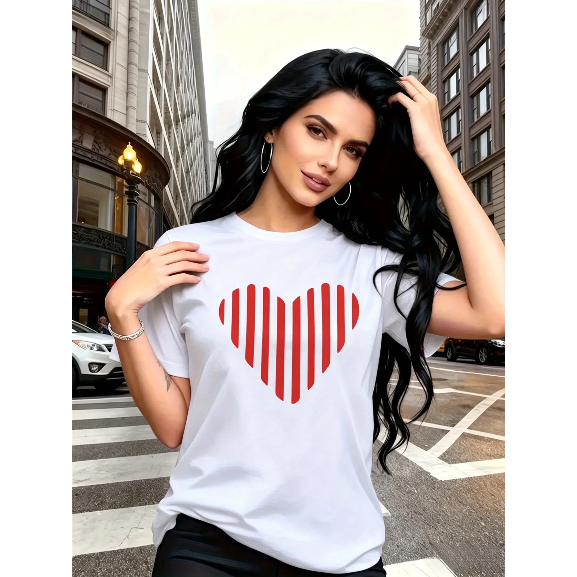 100% cotton, modern minimalist style, red vertical stripes combined into a heart-shaped pattern print, trendy and fashionable, simple round neck, casual and versatile short-sleeve women's T-shirt, suitable for leisure and travel