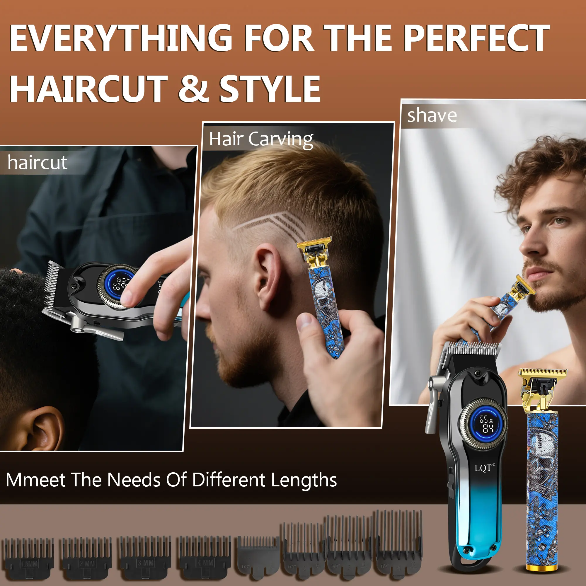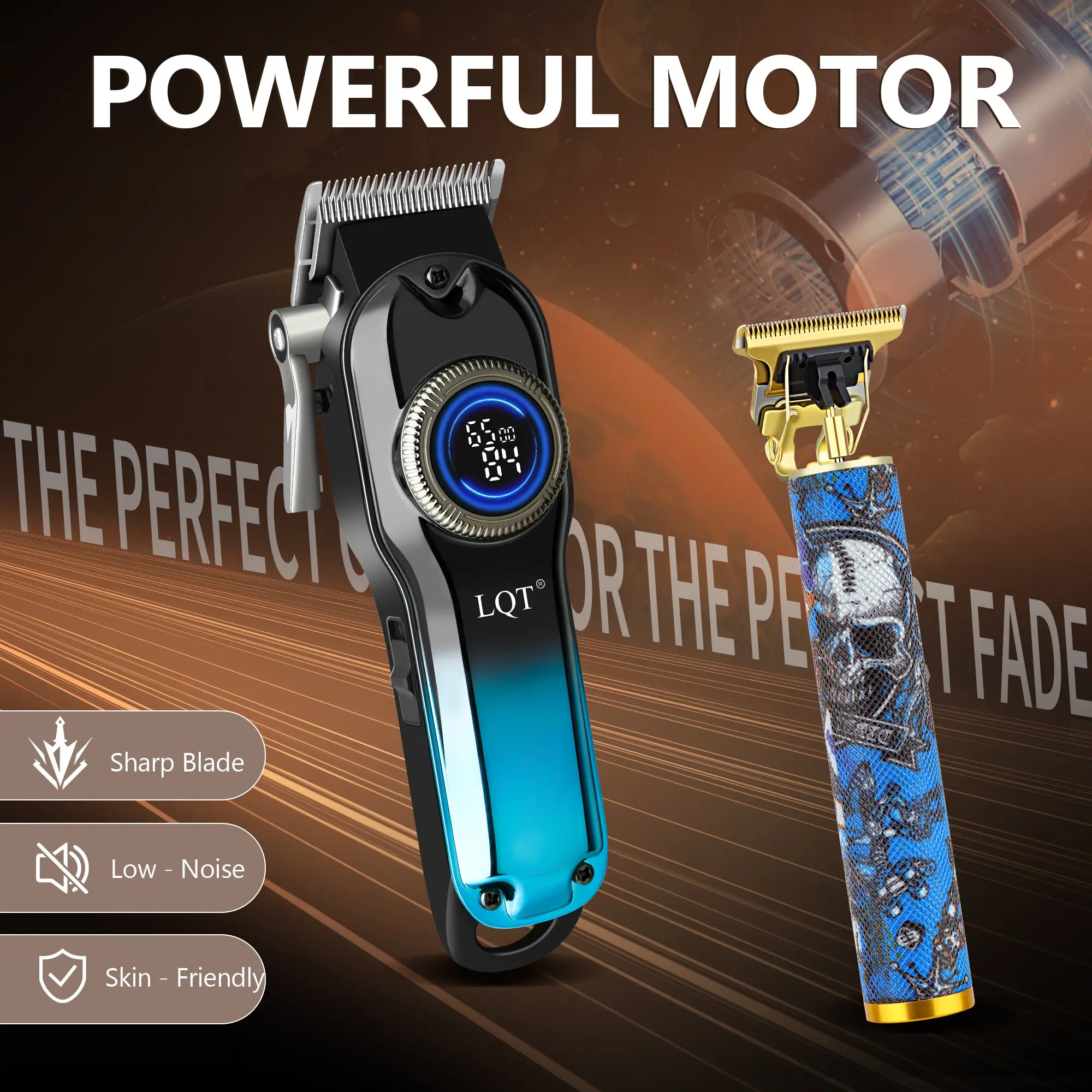 LQT Blue Gradient Skull Graffiti 2-in-1 Men's Grooming Kit, Cordless Hair Clipper with LED Display, Gold T-Blade Trimmer, Complete Rechargeable Barber Set for Salon & Home DIY Fades, Edges & Beard Styling