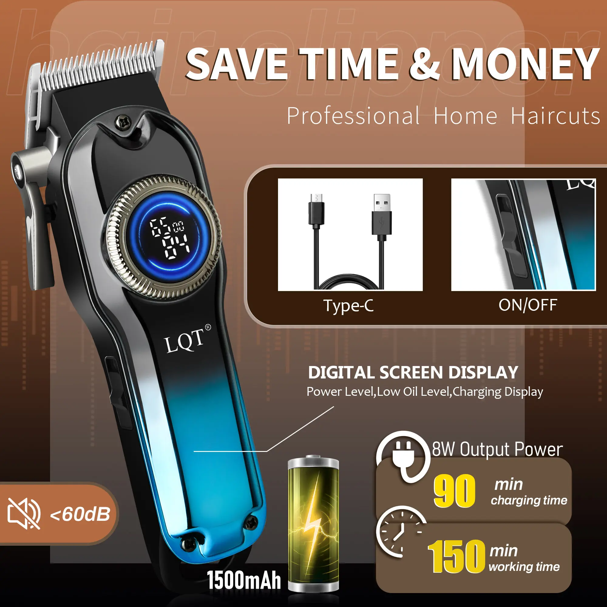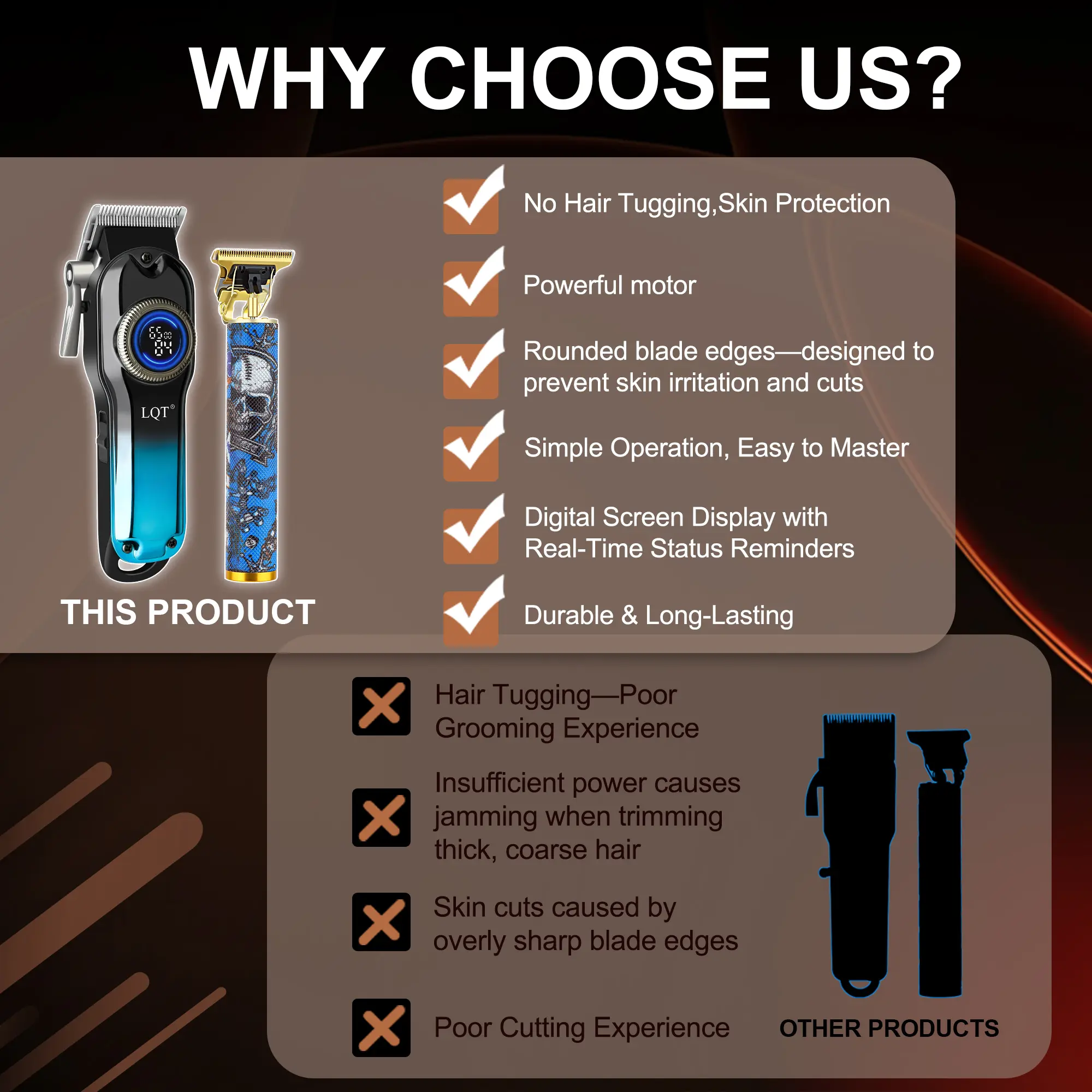 Level up your grooming game with this head-turning street-style 2-in-1 set, built for the modern man who demands bold style and pro-level performance. The gradient blue cordless hair clipper features a vibrant LED display for real-time battery and speed monitoring, delivering ultra-smooth, precise fades and haircuts with zero tugging. The skull-engraved gold T-blade trimmer carves sharp, clean edges and custom beard designs, letting you craft head-to-toe looks that stand out.