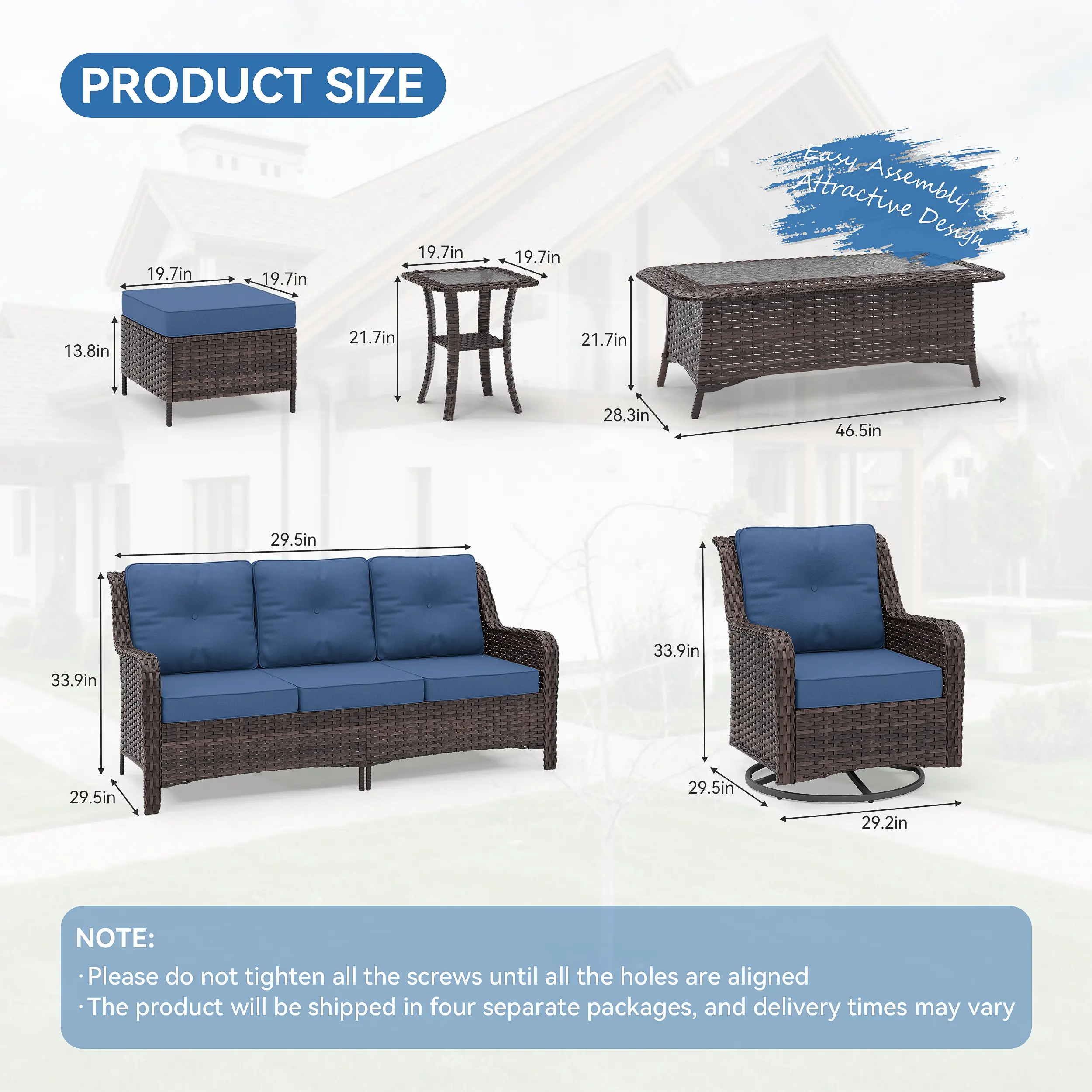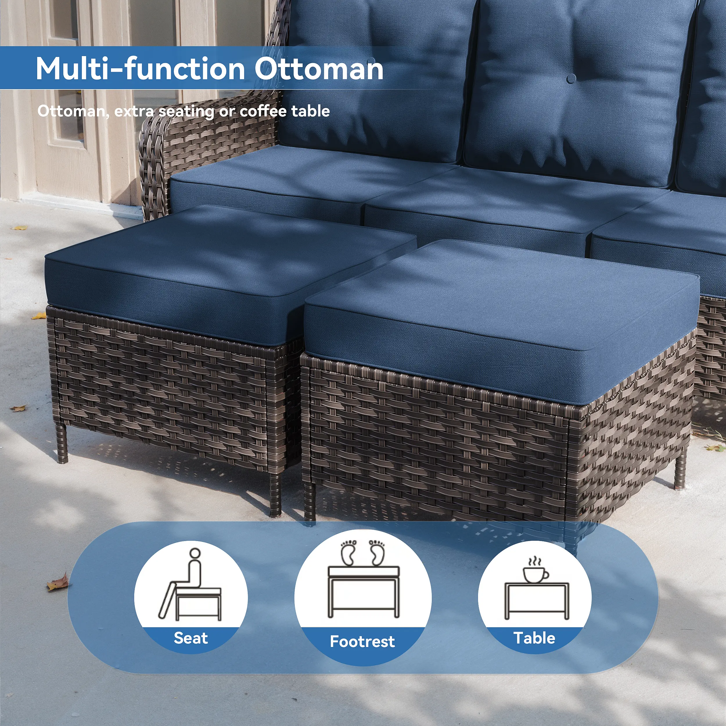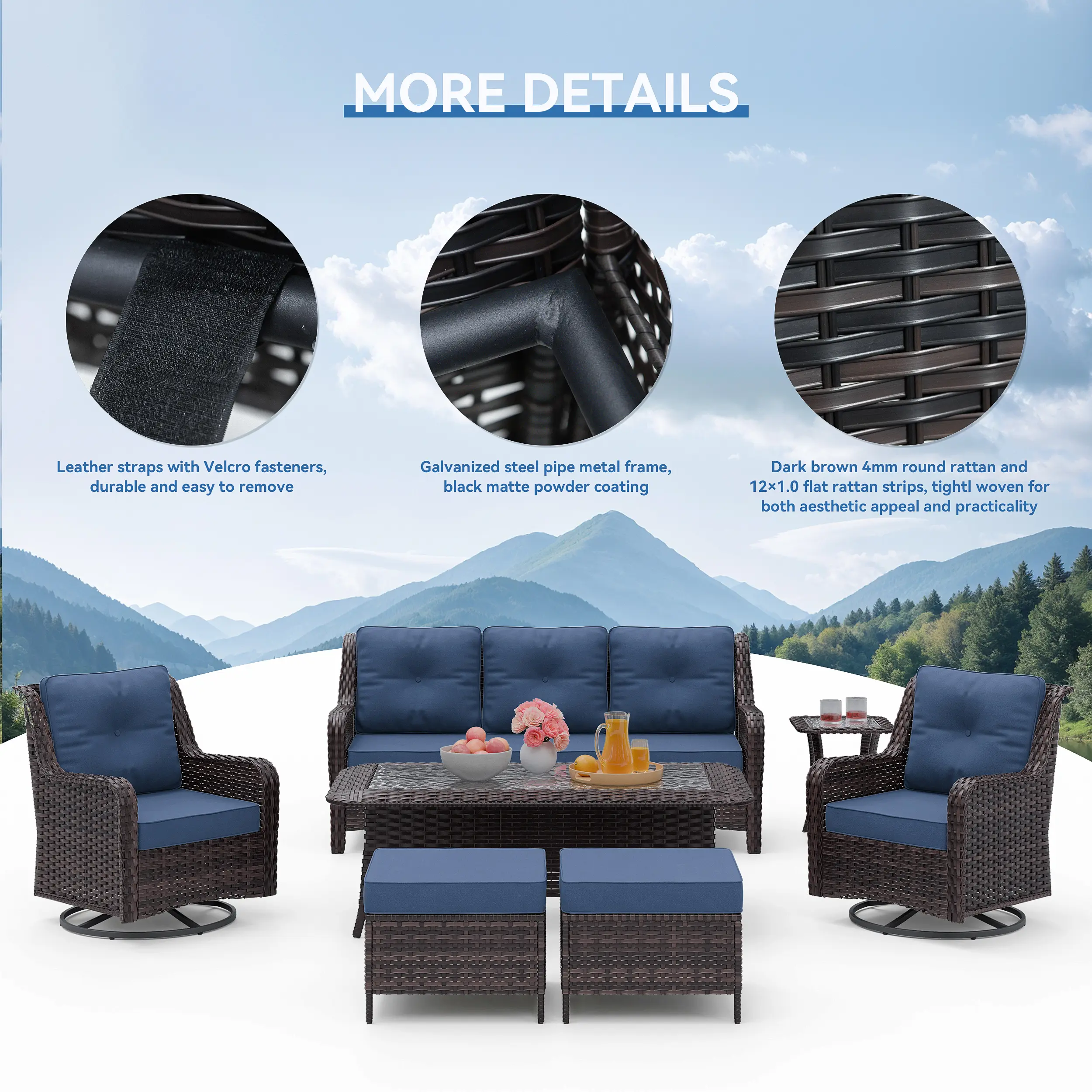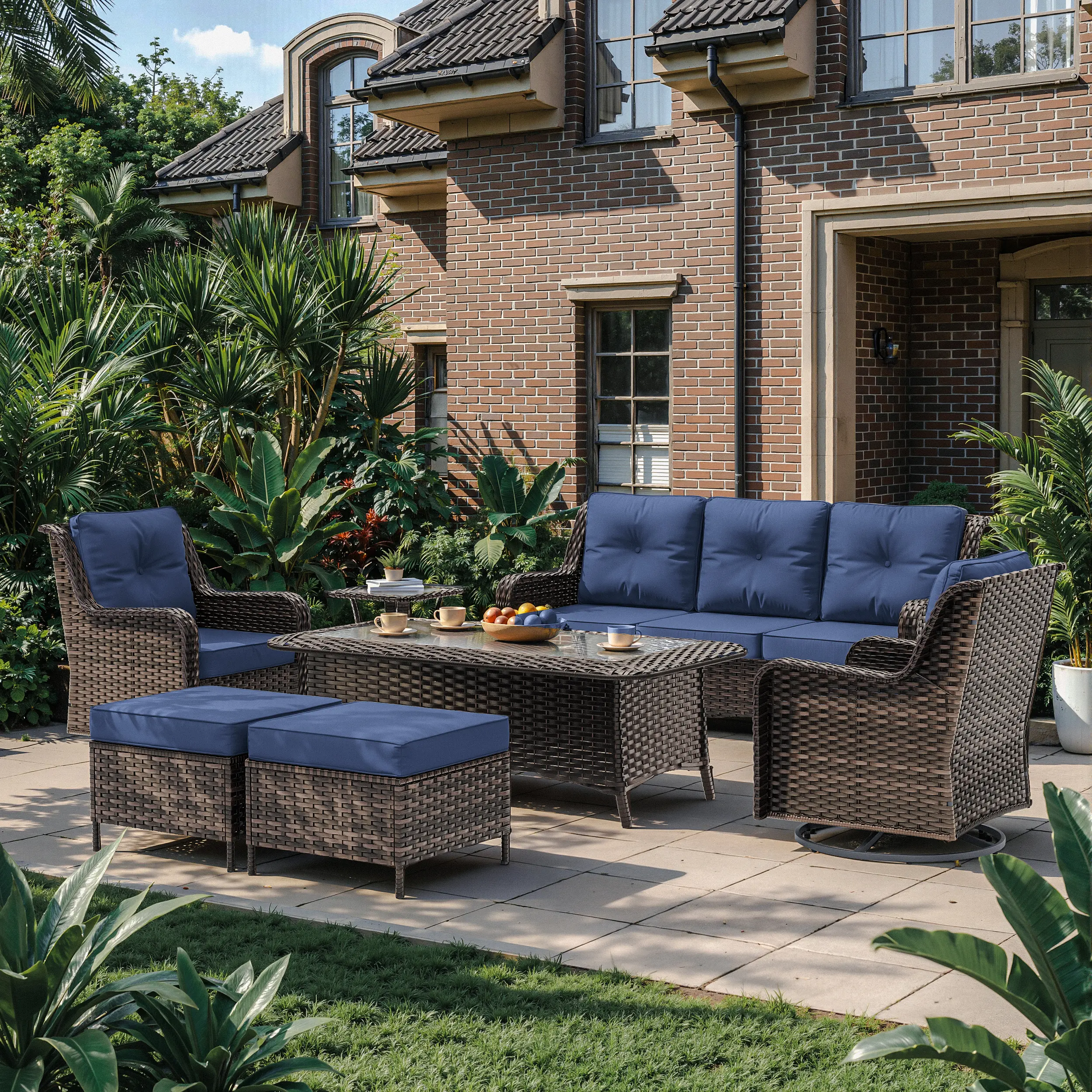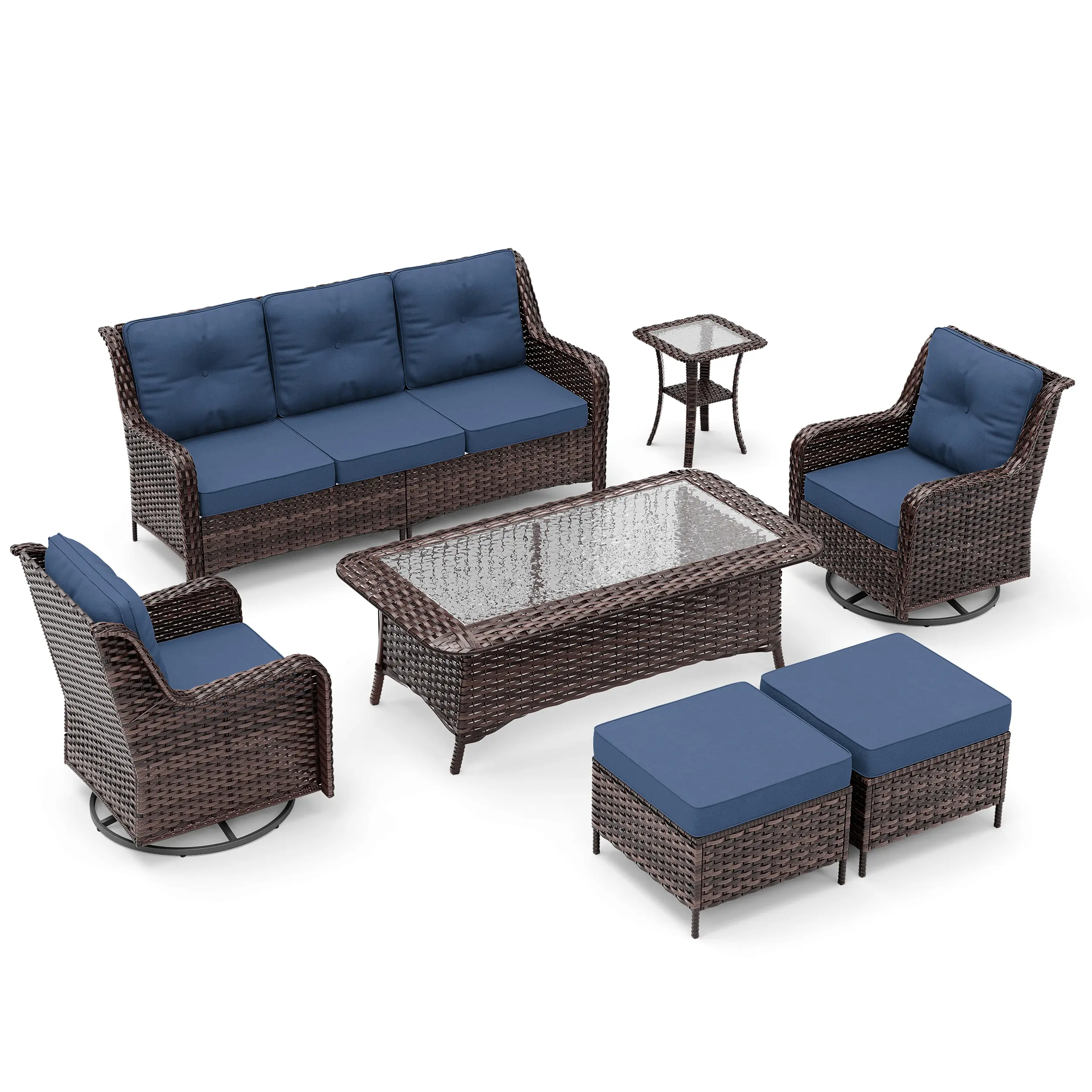 ·【Outdoor Rattan Sofa Set】This outdoor rattan sofa set includes a 3-seater sofa, two swivel rocking chairs, two footstools, and two coffee tables, available for purchase according to your needs.
