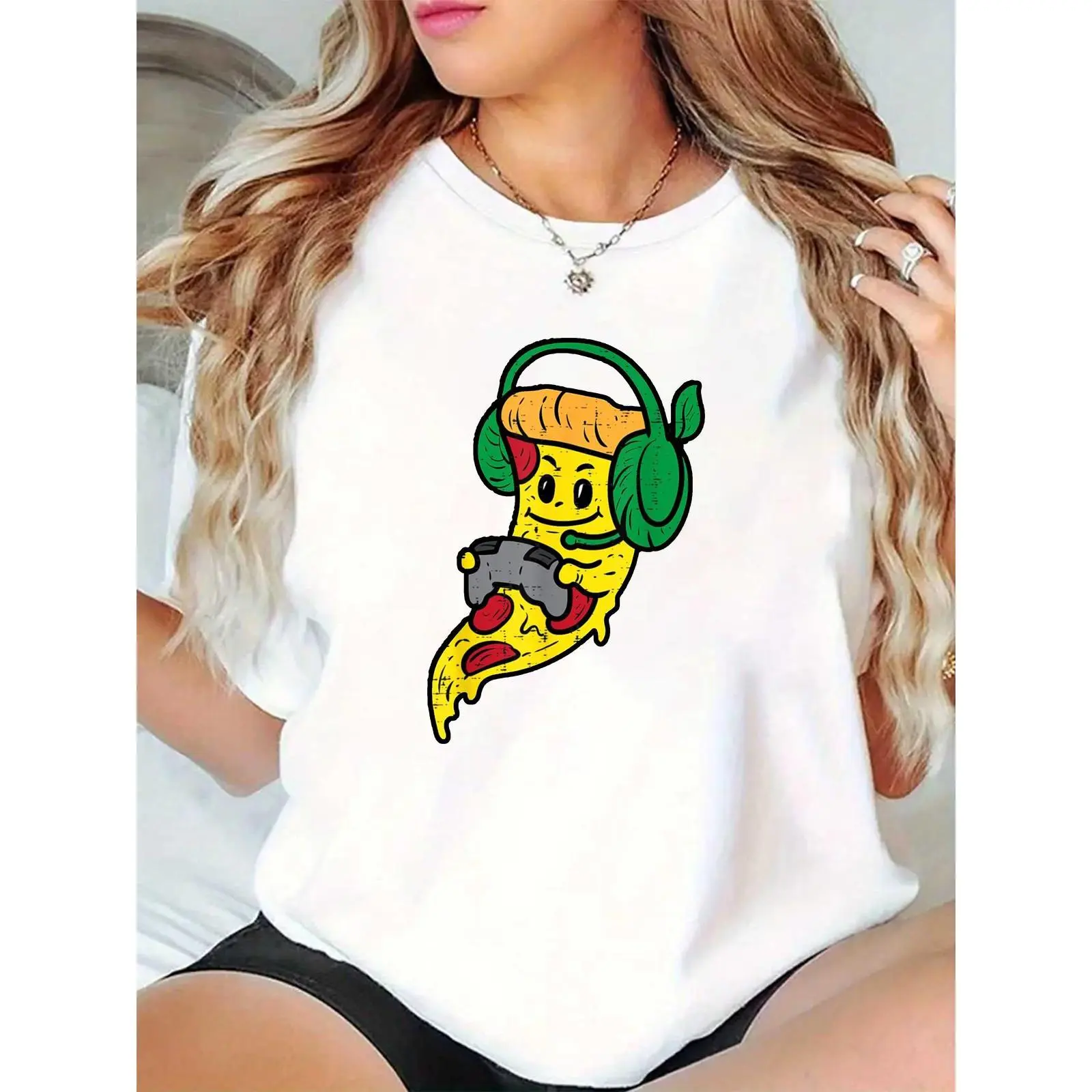 Women's Cute Gamer Pizza Slice T - Shirt with Green Headphones & Game Controller, Casual Cartoon Graphic Tee for Gamers & Pizza Lovers, Ideal for Daily Wear, Gaming Nights, Pizza Parties 100% Cotton T-shirt