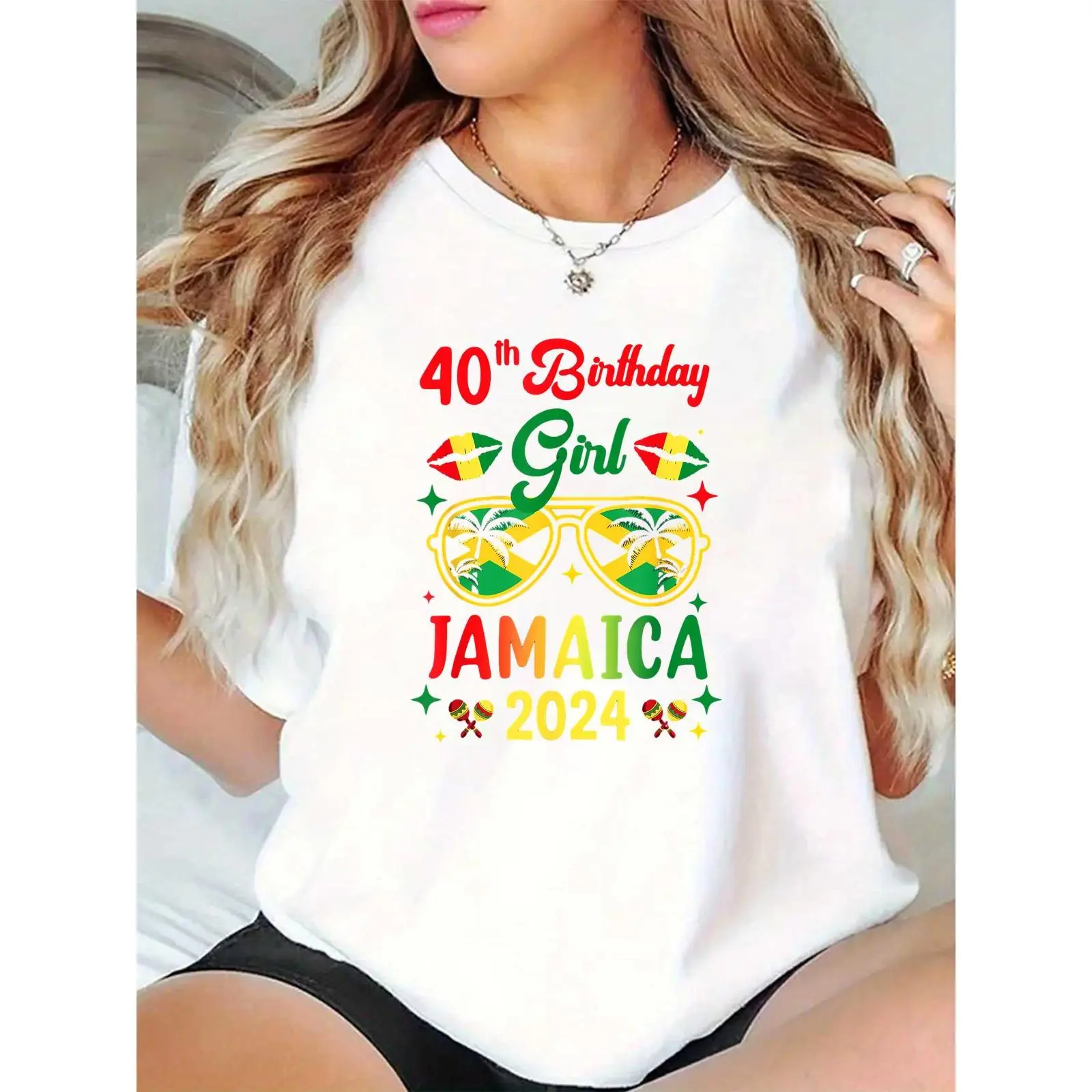 Women's 40th Birthday Girl Jamaica 2024 T - Shirt, Jamaica Flag Colors Palm Tree Maracas Print, Birthday Party Vacation Casual Tee for Ladies 100% Cotton T-shirt