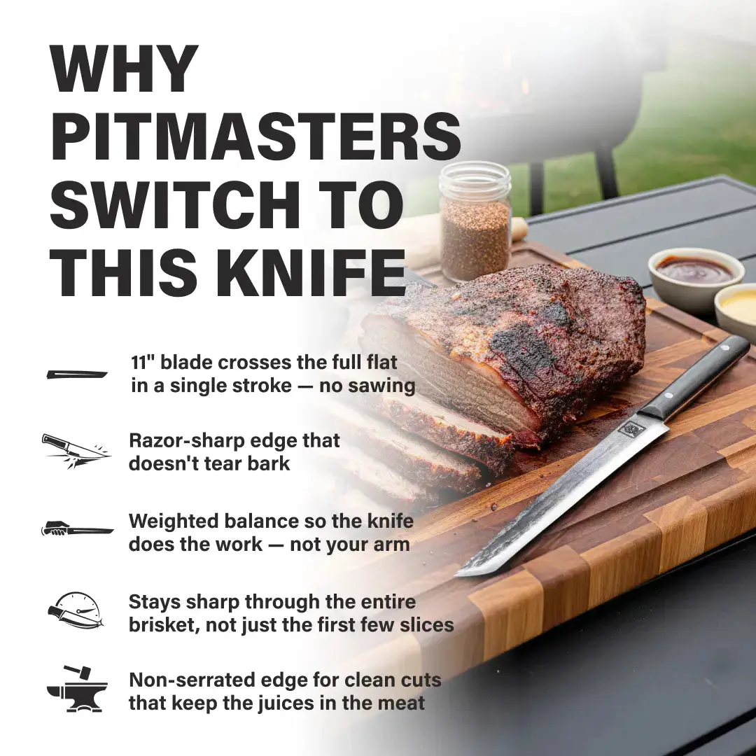 The Ronin is a long, ultra-thin slicing knife built for precision above all else. Its extended blade length allows you to slice proteins in a single, smooth motion - perfect for carving roasts, slicing brisket, trimming fat, and creating clean, paper-thin cuts without tearing. The narrow profile reduces drag, giving you maximum control and uniform results every time. Hand-forged from high-carbon steel and lightweight in hand, the Ronin is ideal for cooks who want clean presentation, accuracy, and effortless slicing on both raw and cooked meats.