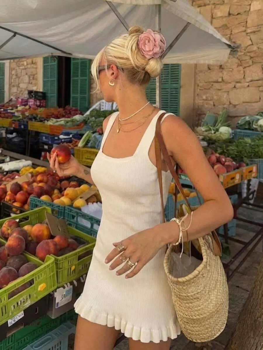 IYUNA Women's Summer Square Neck Fitted Knit Dress Ruffle Hem Design Suitable For Summer