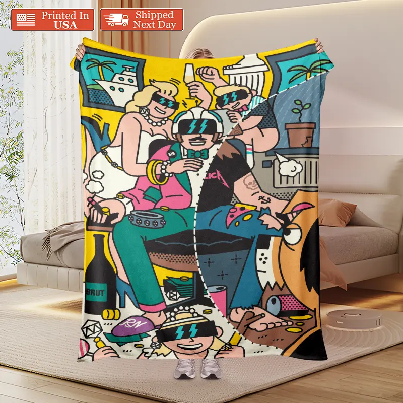 Cozy Flannel Blanket, Vibrant Pop Art Luxury Party & Yacht Scene Throw Blanket, All-Season Warm Rich Life Celebration Blanket for Couch, Bed, Camping & Gift, Aesthetic Bold Graphic Design Home Decor