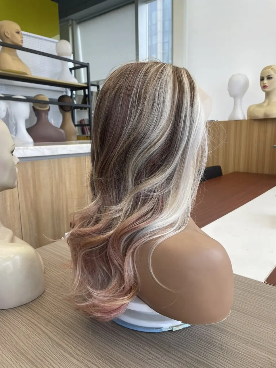 Light Brunette with Platinum Blonde to Blush Pink creating dimensional beauty that shifts under sunlight/indoor lighting. Natural pre-plucked hairline, the wavy texture adds voluminous bounce work magic to enhance all face shapes, suitable for all occasions like daily wear, date nights, office meetings, or festival parties.