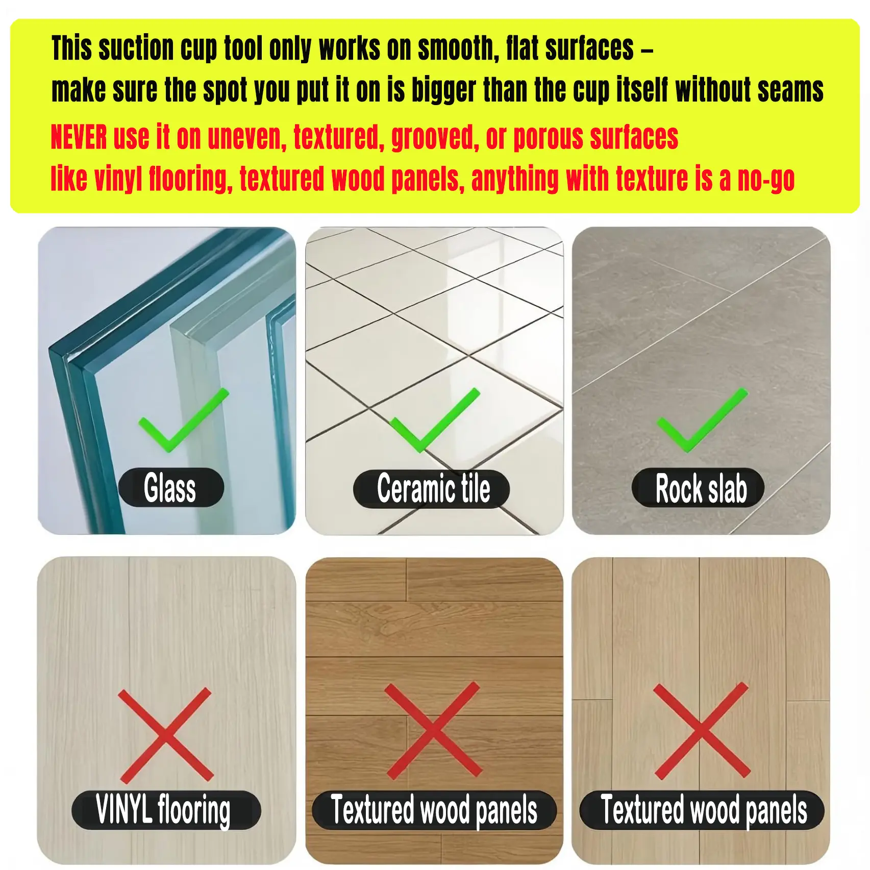 Our seam setter is built with a premium soft rubber suction cup that locks on TIGHT-holding up to 110lbs without slipping!It works flawlessly on smooth, flat, non-porous surfaces like granite, marble, glass, and tile, so you get perfect alignment and seamless installs every single time.