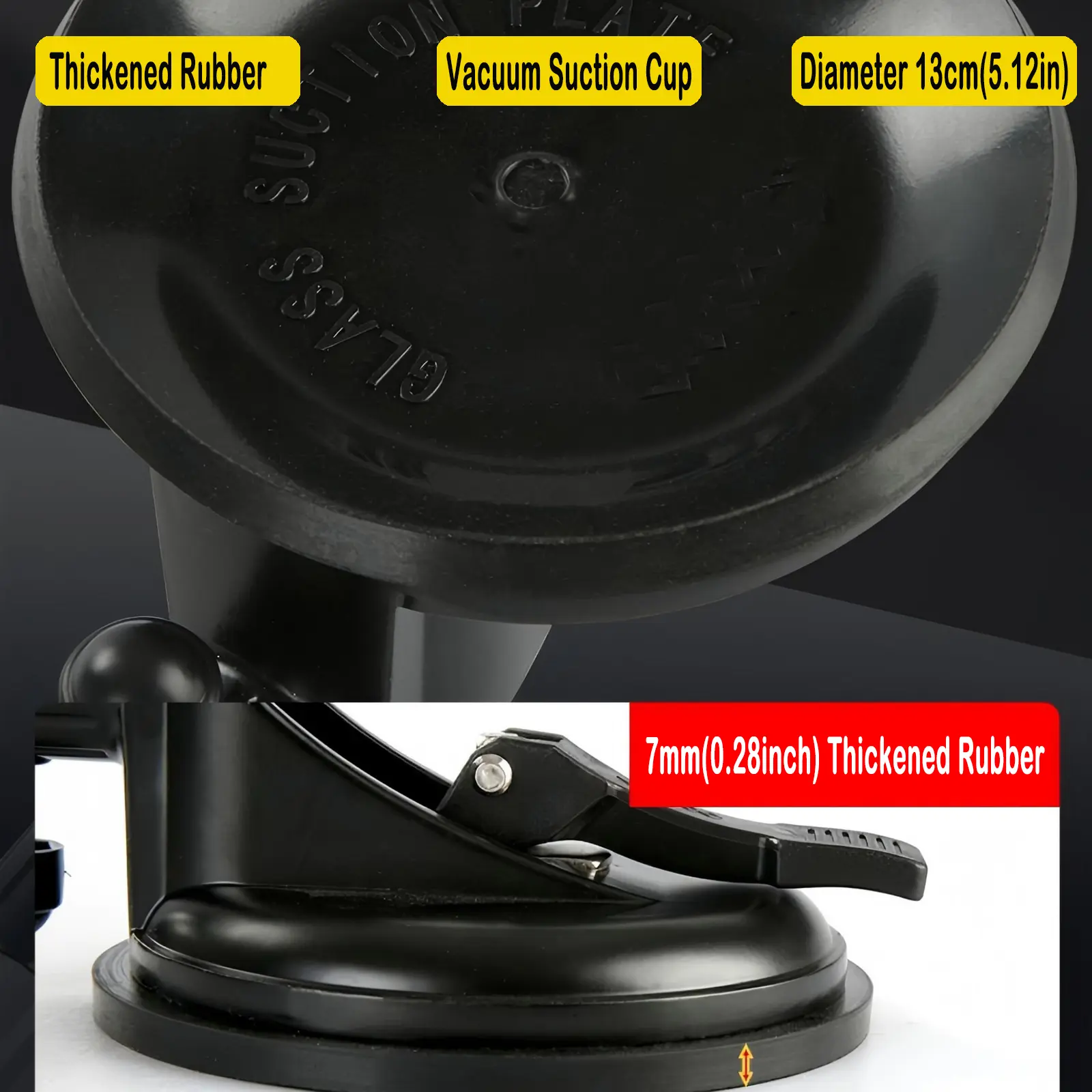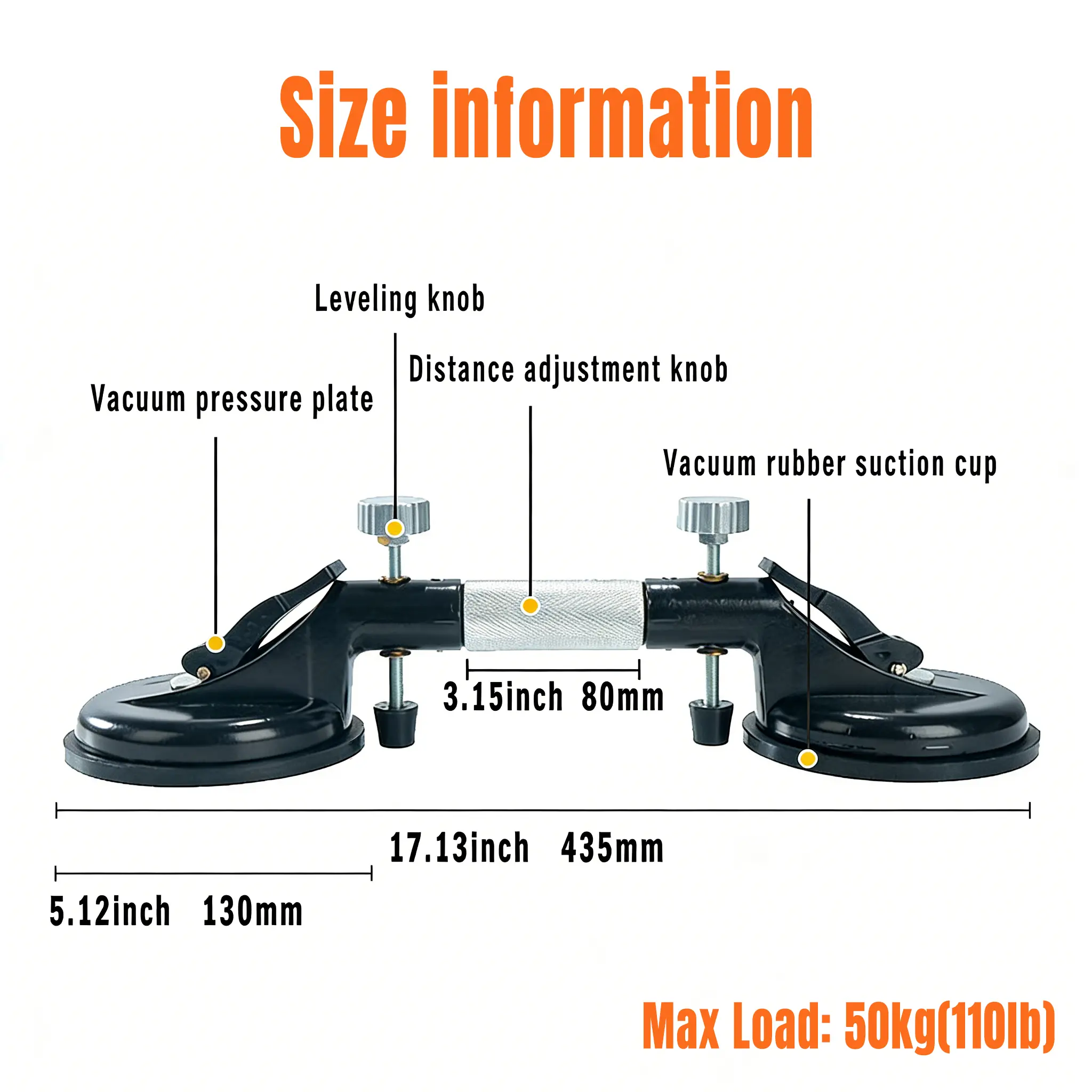 Total Length: 435mm (17.13")| Rubber Thickness: 7mm (0.28")| Suction Cup Diameter: 130mm (5.12")| Max Suction Weight: 50kg (110.2lbs)