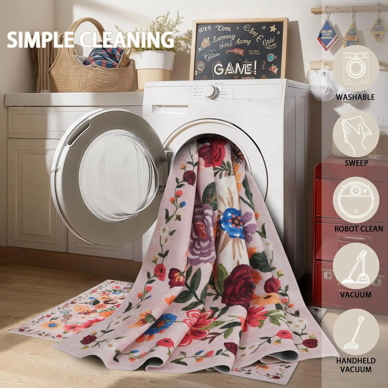 WASHABLE & EASY CARE: Spills and messes are no worry!This Pink 4x6 boho rug is machine washable (cold water, gentle cycle)-just air dry.Perfect for kids, pets, or high-traffic areas.Vacuum or shake for daily upkeep.NON-SLIP BACKING: No extra rug pad needed!The TPR-coated backing grips floors securely, while the low-pile design (0.35" thick) stays flat and safe.Soft yet durable faux wool fibers resist fading.BOHO FLORAL DESIGN: Vintage-inspired floral patterns add charm to any space-bedroom, office, dining room, or nursery.Machine-woven for precisioncolors stay vibrant wash after wash.KID & PET-FRIENDLY: Ultra-soft underfoot and stain-resistant, this rug handles life’s messes.Low pile prevents tripping, ideal for playrooms or busy households.Babovid QUALITY: We craft stylish, eco-friendly rugs to elevate your home. Every detail-from fibers to packaging-is tested for durability and comfort. Explore more designs!