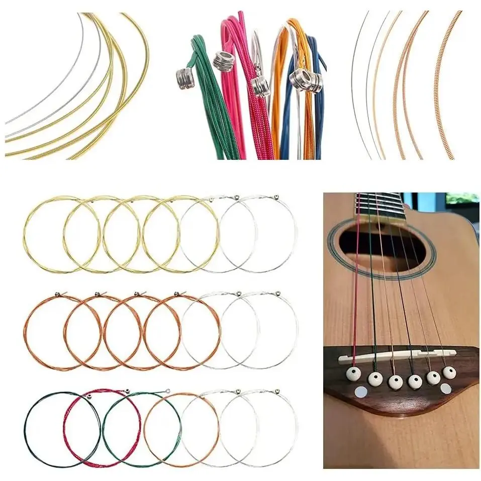 [3 Sets of Guitar String]Smooth and Balanced Strings, which are made of bronze with rustproof coating.1 set of Multicoloured, 1 set of Red, 1 set of Gold;Each set include 6pcs guitar strings.E-1st.012 inch;B-2nd.016inch;G-3rd .024inch;D-4th .032inch;A-5th .042inch;E-6th.053inch.