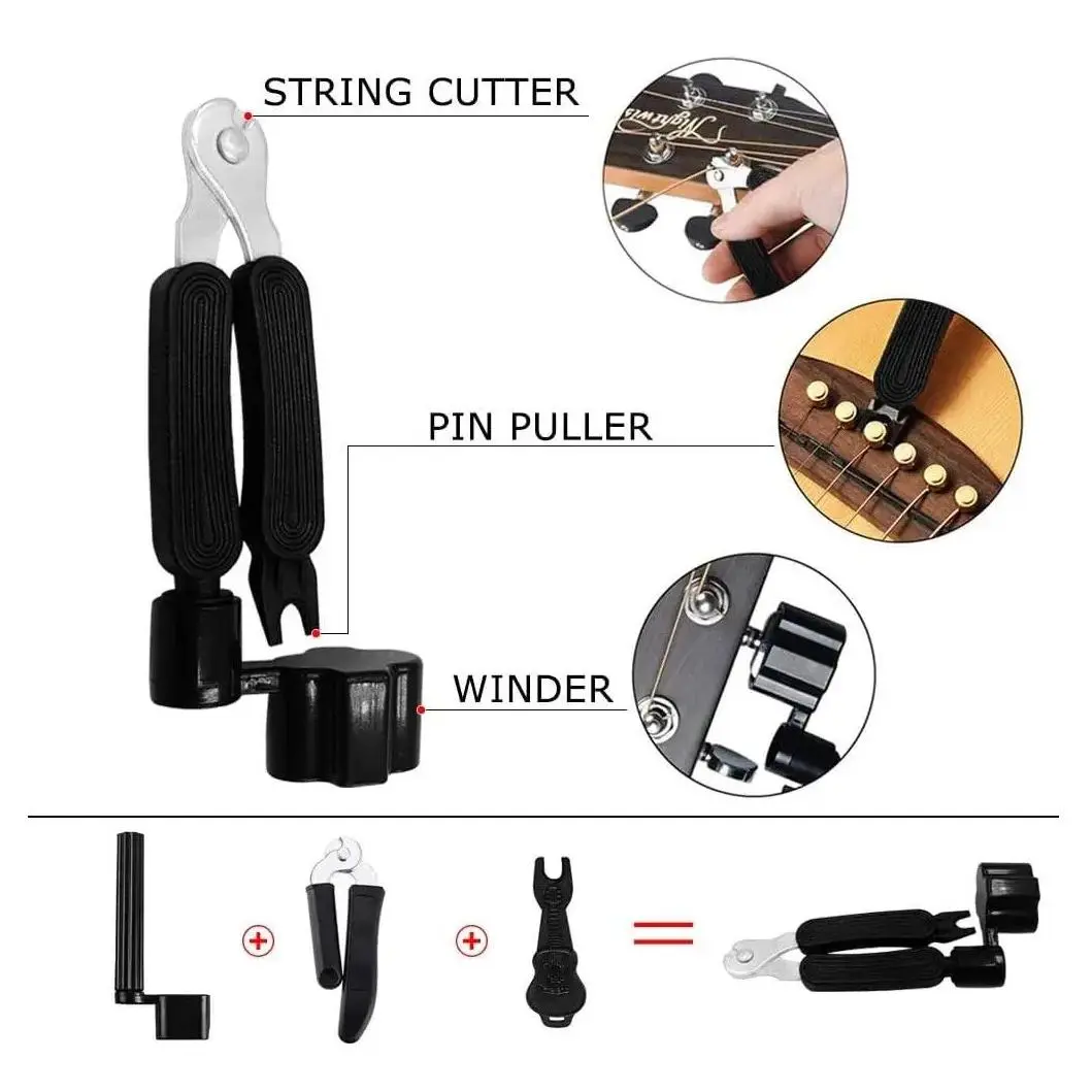 [3 in 1 guitar string winder cutter and pin puller]Made of strong ABS and steel material that is easy to cut string.String winder and cutter can better help beginner change guitar strings.Multi-functional and ergonomically designed for efficient and comfortable use, that fits virtually all guitars, banjos and mandolins.