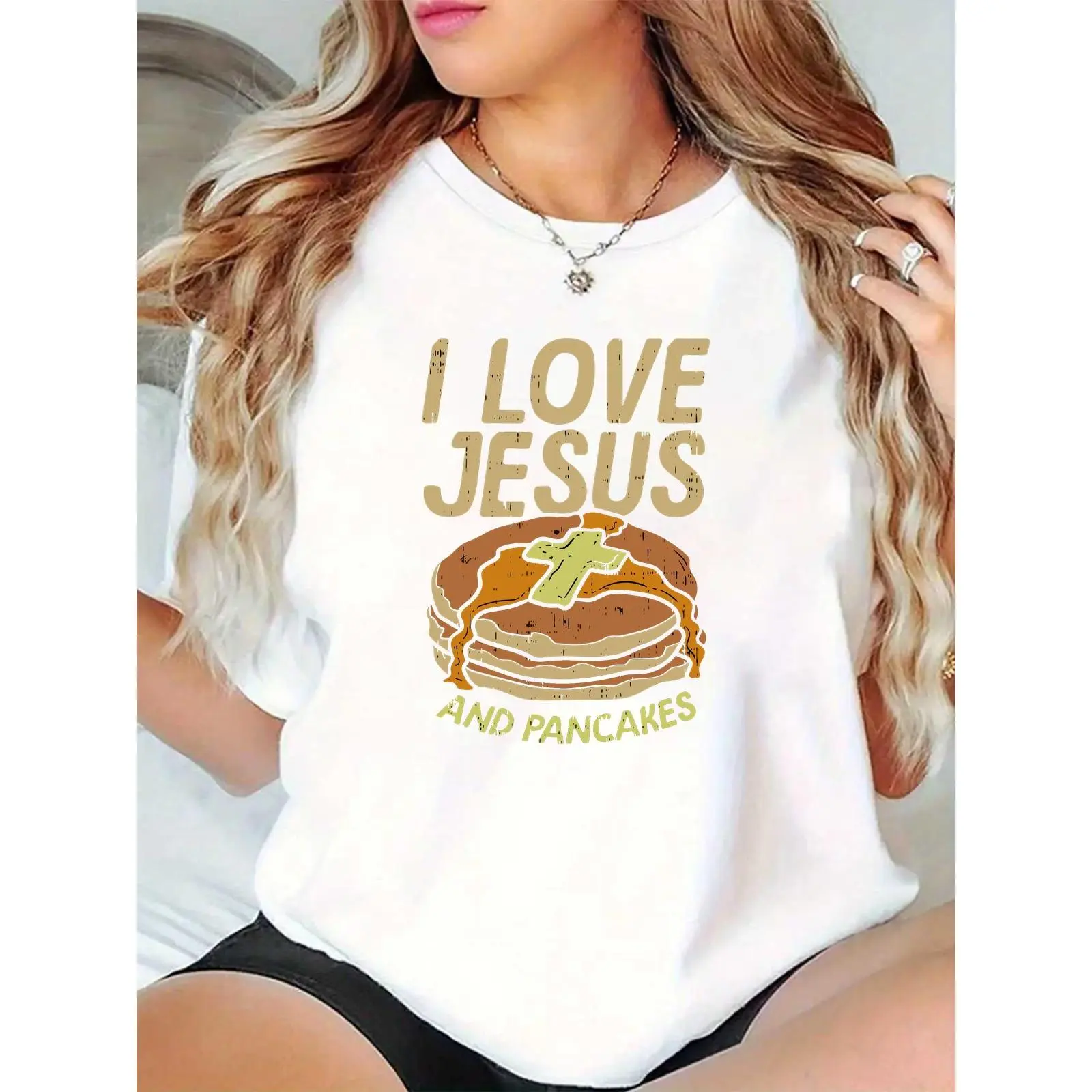 Women's I Love Jesus & Pancakes T-Shirt with Pancake Stack & Cross Graphic Casual Daily Brunch Christian Fashion Top 100% Cotton T-shirt