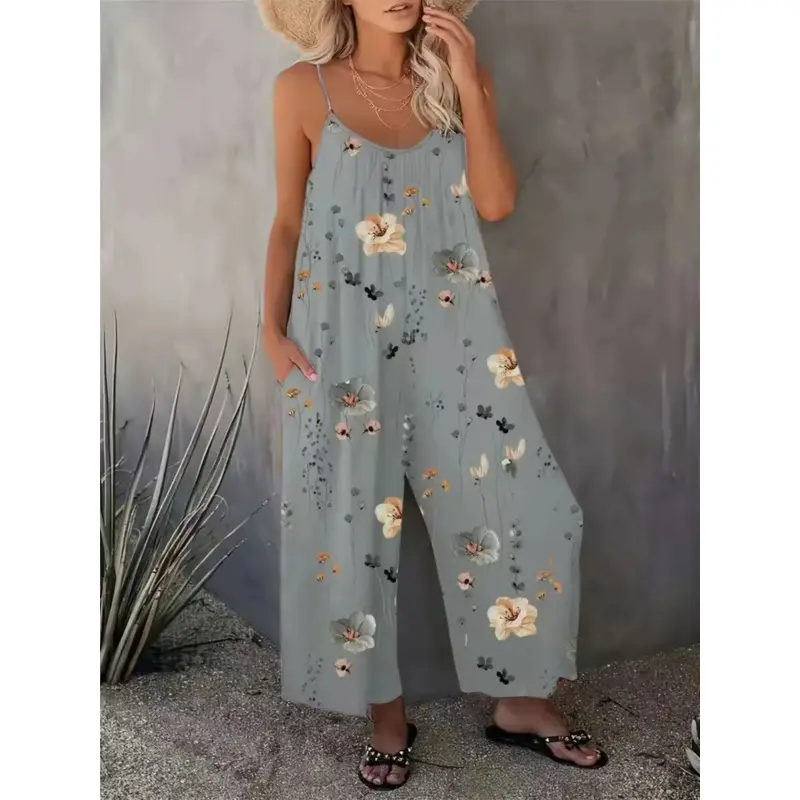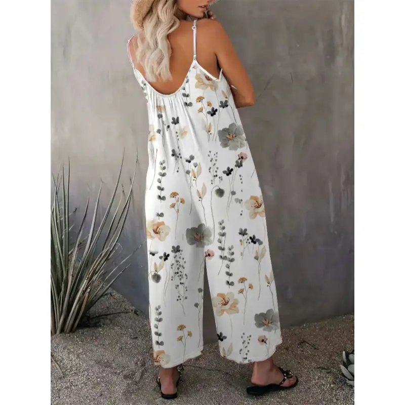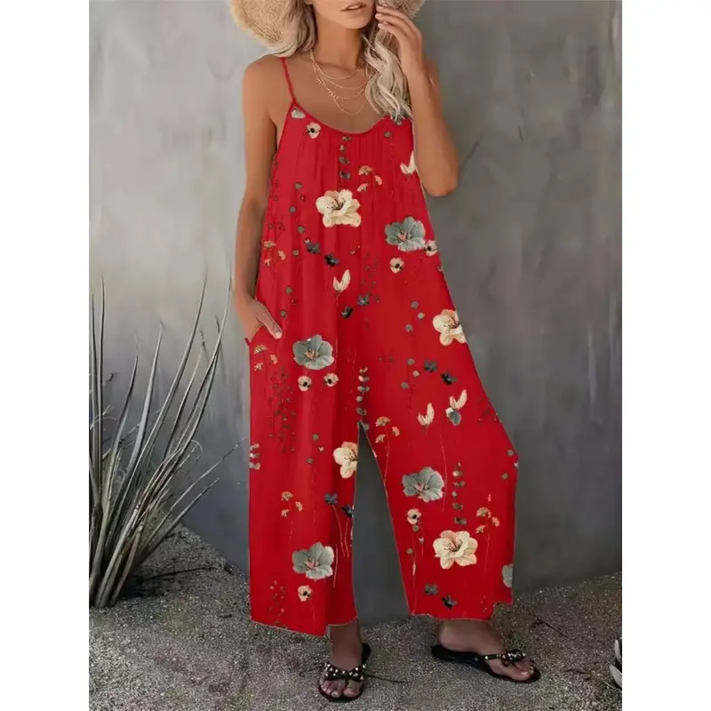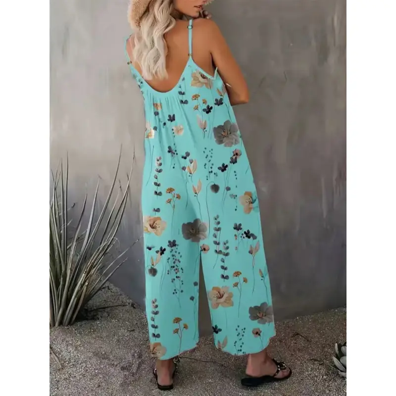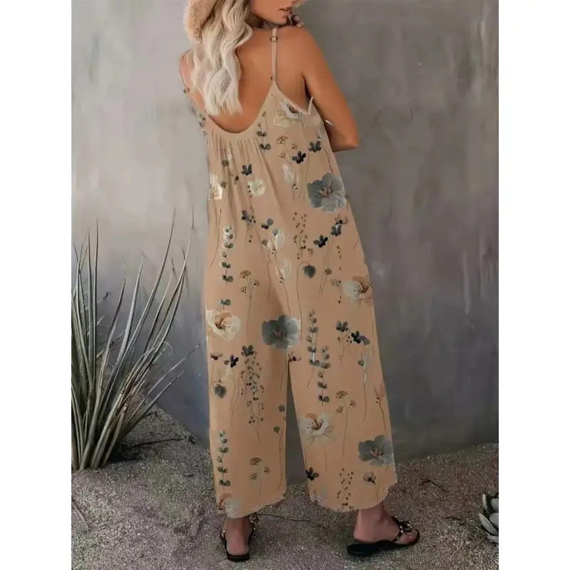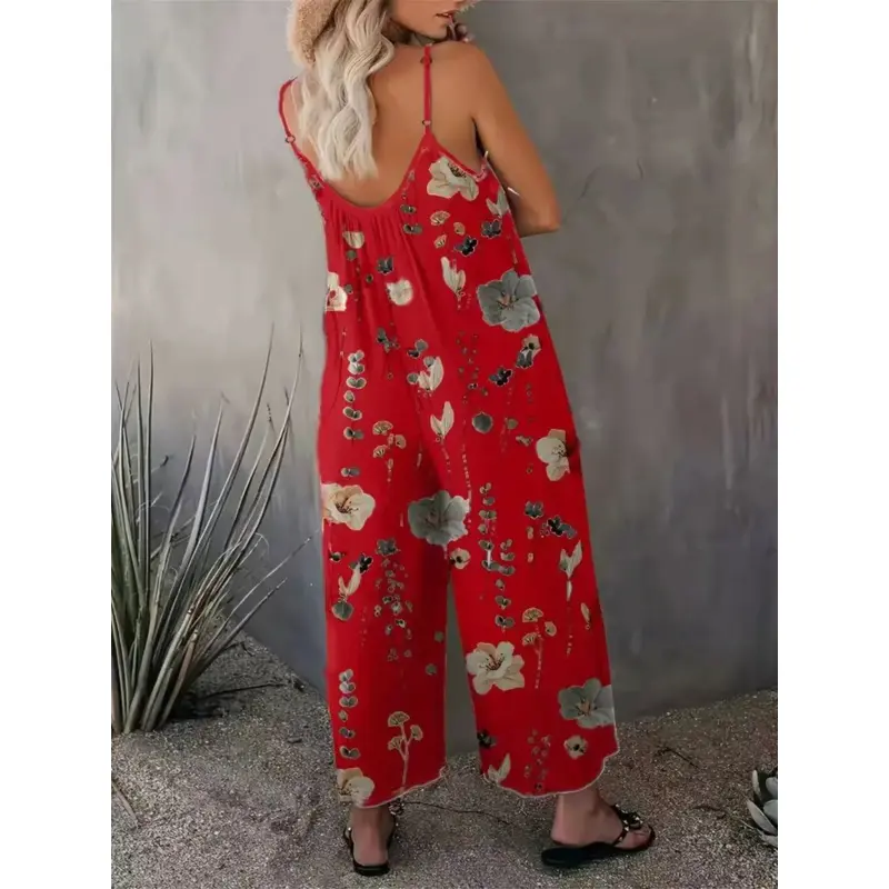 Title: Women's Comfortable Loose Floral Jumpsuit – U-Neck Ruched Fit Sleeveless Vacation Romper with Pockets| Perfect Summer Travel Selection