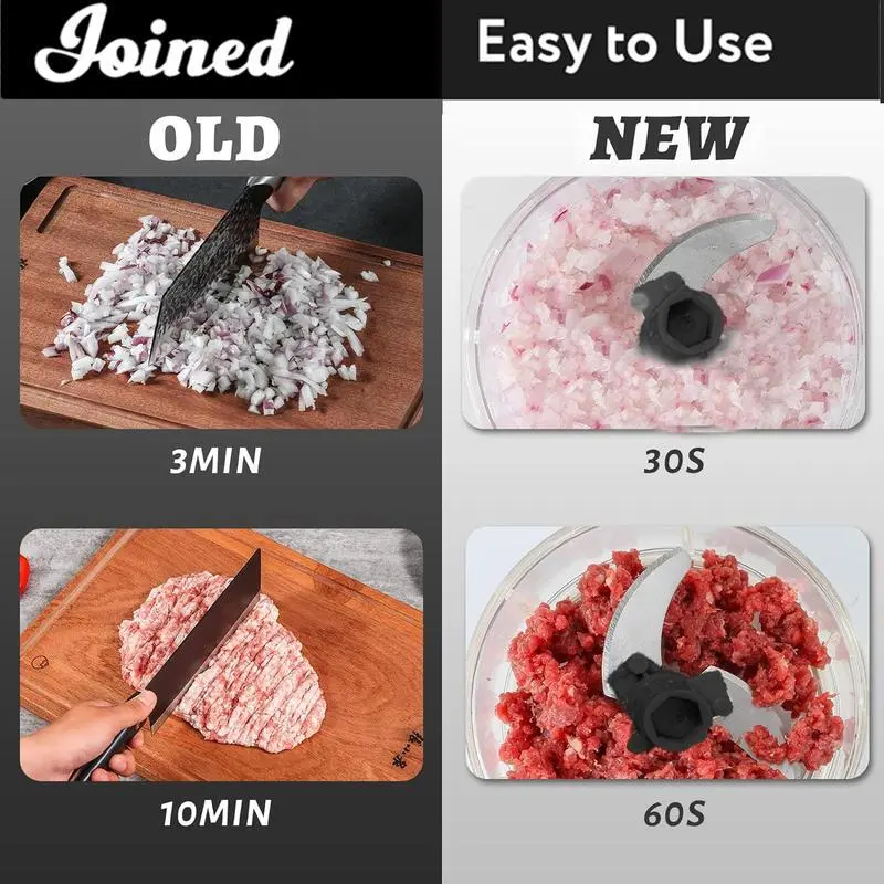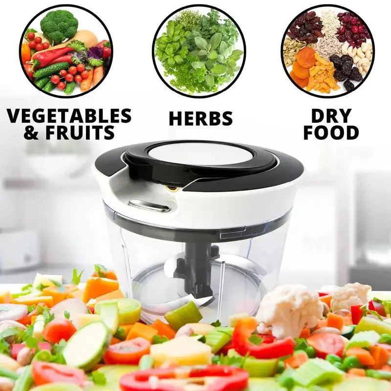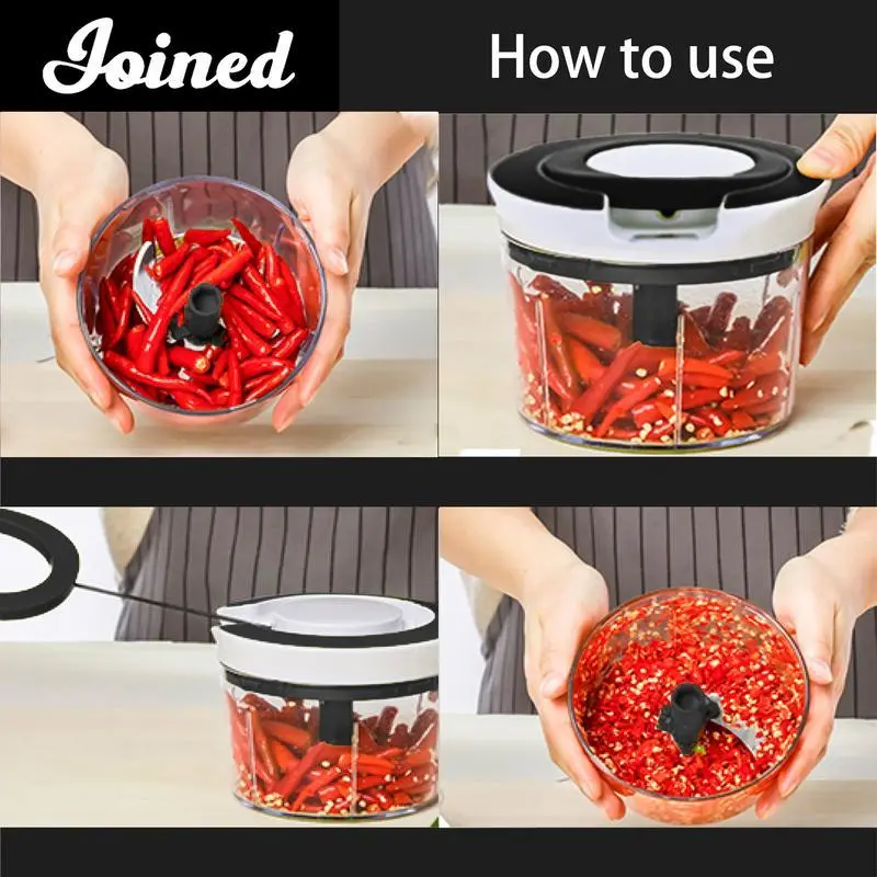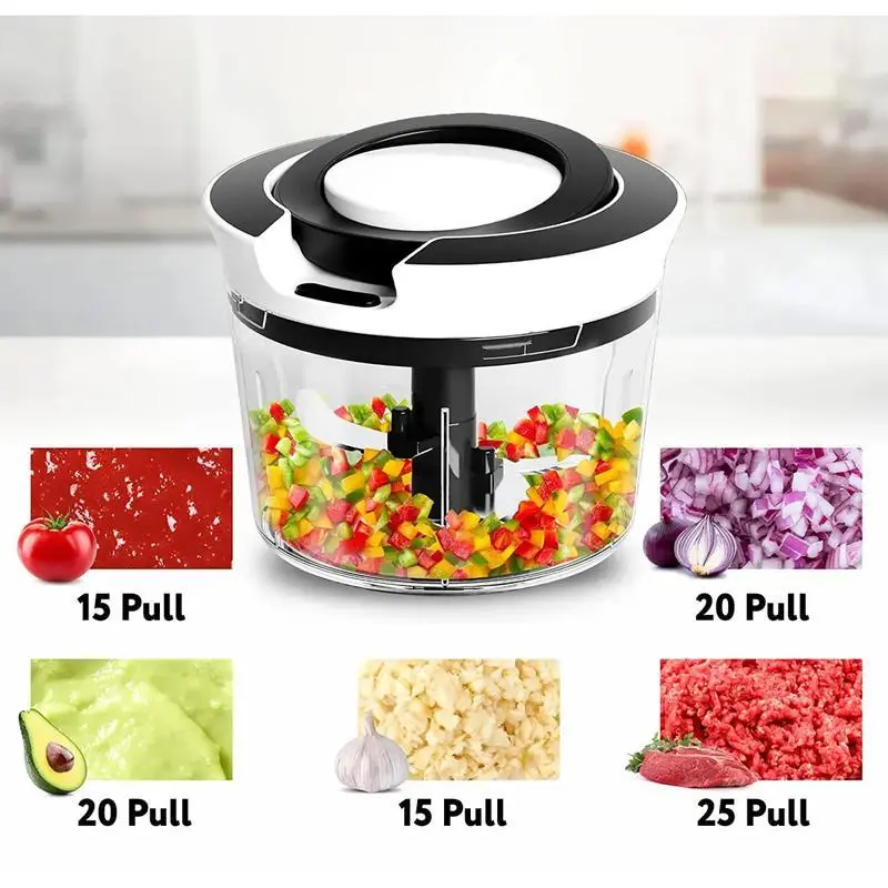 Save time: About 2 cups is enough for your kitchen needs.When you pull on the string, the blade rotates quickly to cut the dish into the shape you want.Pull it about 5 times,lt's going to take about 5 seconds,lt's a rough cut.10 to 15 is a fine cut that takes 10 seconds.More than 15 times can be used for dipping.Very fast and saves time