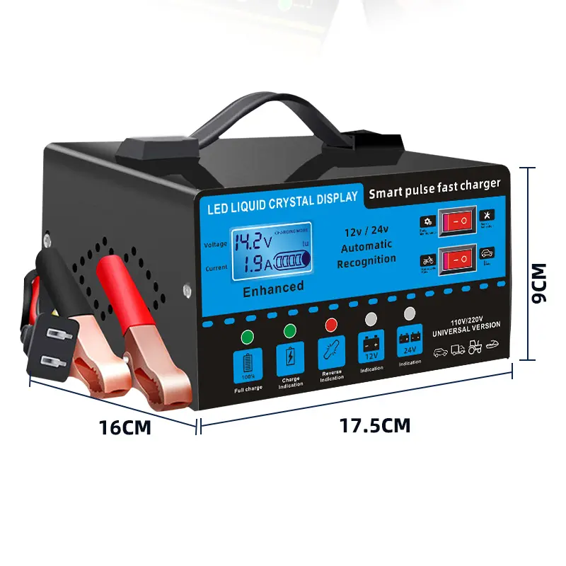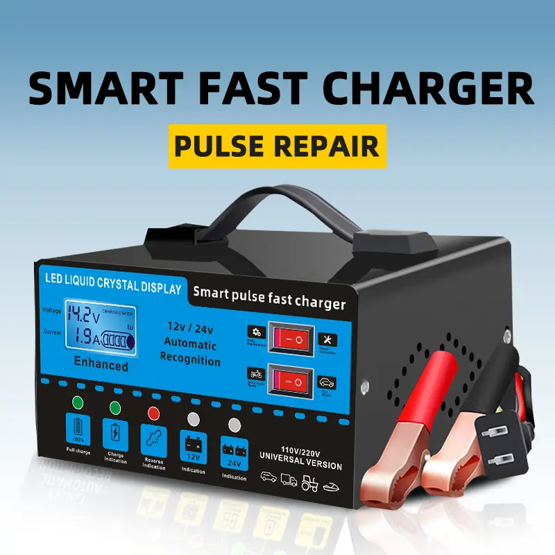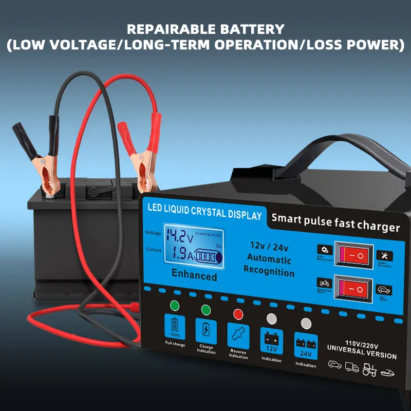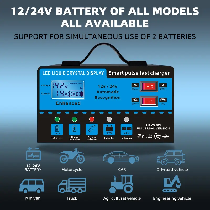 12V and 24V smart universal battery charger with LCD display, smart maintenance, temperature compensation, overcharge and short-circuit protection, suitable for intelligent trickle charging and maintenance of car, SUV, truck, yacht, emergency starter