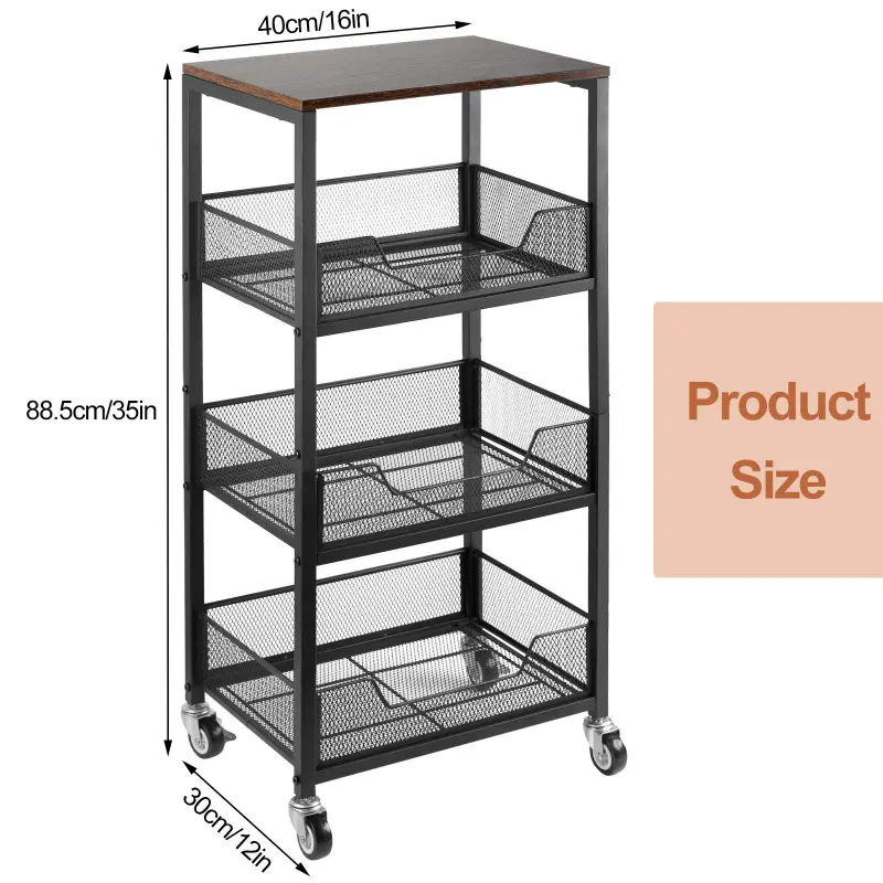 Large Capacity & Design: The 3-tier structure (plus the wood top surface) offers ample vertical storage.Tilted front baskets ensure easy access to contents like fruits, vegetables, or daily necessities.