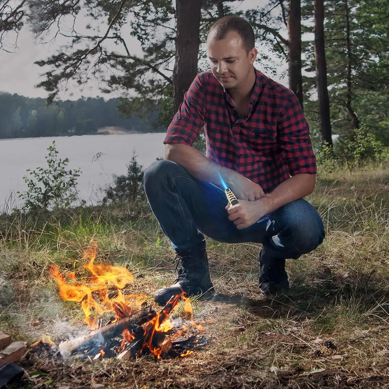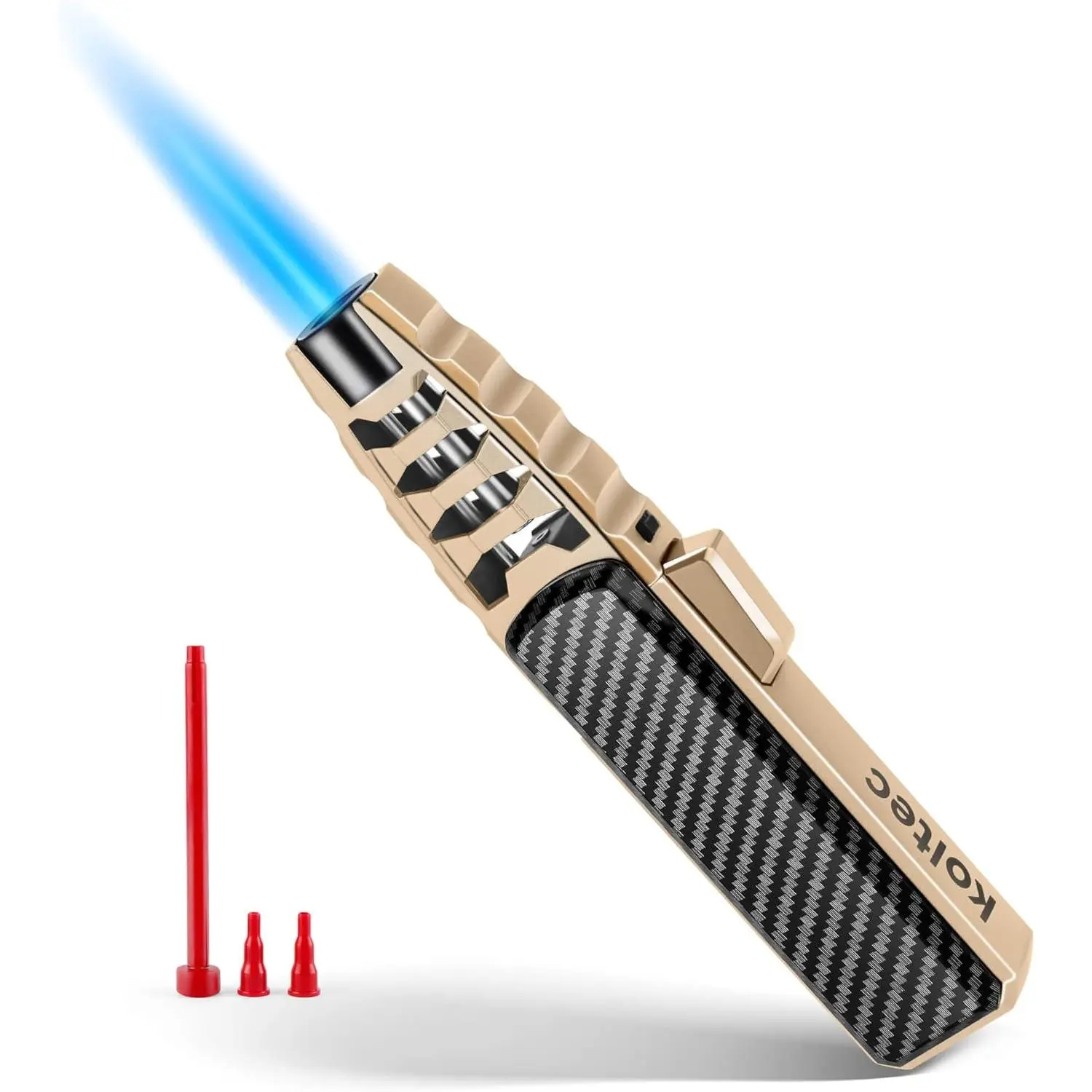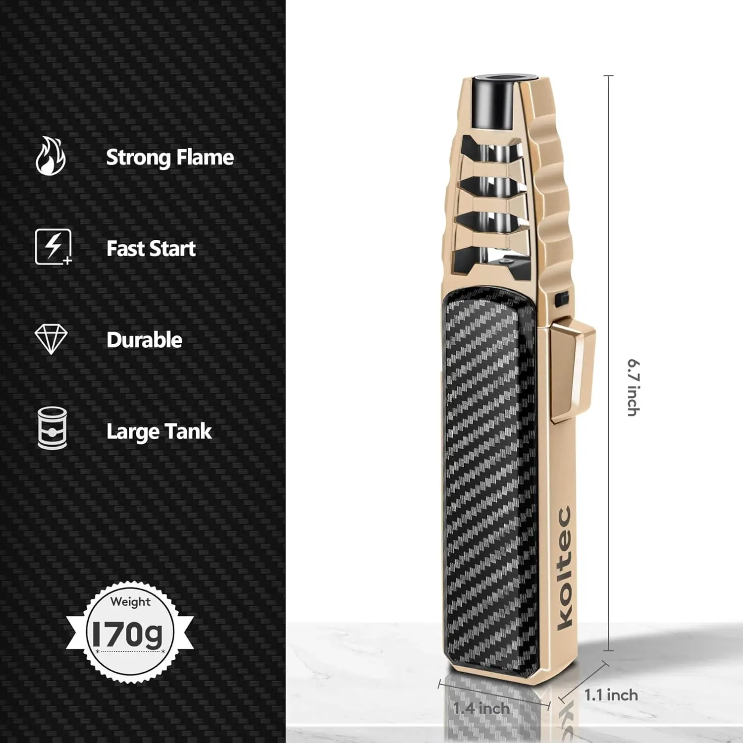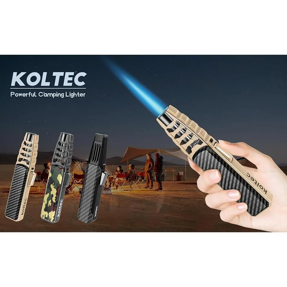 Ultra Powerful flame : The windproof jet flame can heat up to 2372℉ and the maximum flame length up to 7.8 inches,it can light up in windy conditions,suitable for outdoor activities like camping,hiking,adventure,survival,kitchen,BBQ,tactical gear,candle,welding etcRefillable & Adjustable Butane Lighter : Compared with disposable lighters,the torch lighter can be refilled many times.Turn the Adjustment towards the side marked(+) to increase the flame and turn to the other side marked(-) to decrease the flameSafety & Fire Lock : Safety lock prevents accidental ignition,just turn the Fire Lock to the right side and the ignition button can't be pressed down.Press the button to light fire, turn the safety lock to the right at the same time, then it will keep continuous firing without your pressing, Baking, cooking is much easierDurable zinc alloy & Box Package: Made from a sturdy zinc alloy, this cooking torch is both robust and lightweight, making it easy to carry for any activity.Its chic design in a gift box is perfect for special occasionsAfter-sale Service: Your satisfaction is important to us.KOLTEC offers reliable customer service, and if you have any questions or need assistance, our friendly team is ready to help with any inquiries