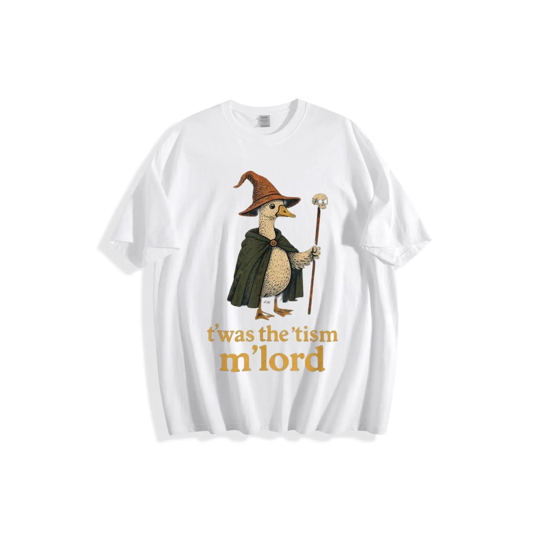 Wizard Duck "Twas the 'Tism M'lord" Funny Whimsical Art Black Background Printed T-Shirt - Crew Neck Novelty Graphic Cotton Tee, Humorous Fantasy Gift for Duck Lovers Pop Culture Fans
