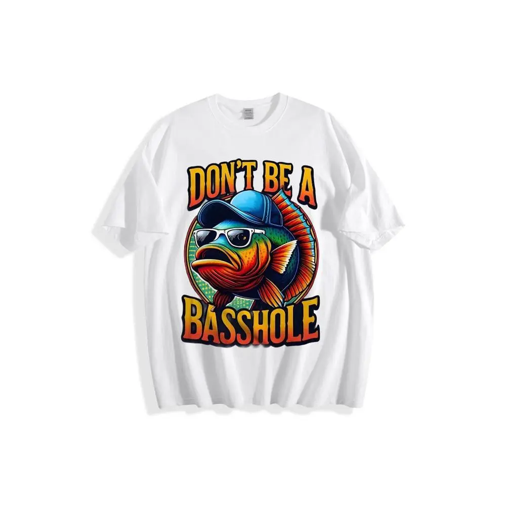 Don't Be A Basshole Fish Graphic T-Shirt - Stylized Colorful Bass with Sunglasses & Cap, Vibrant Teal Yellow Polka Dot Design, Bold Orange-Outlined Yellow Text, Comfortable Cotton Crew Neck