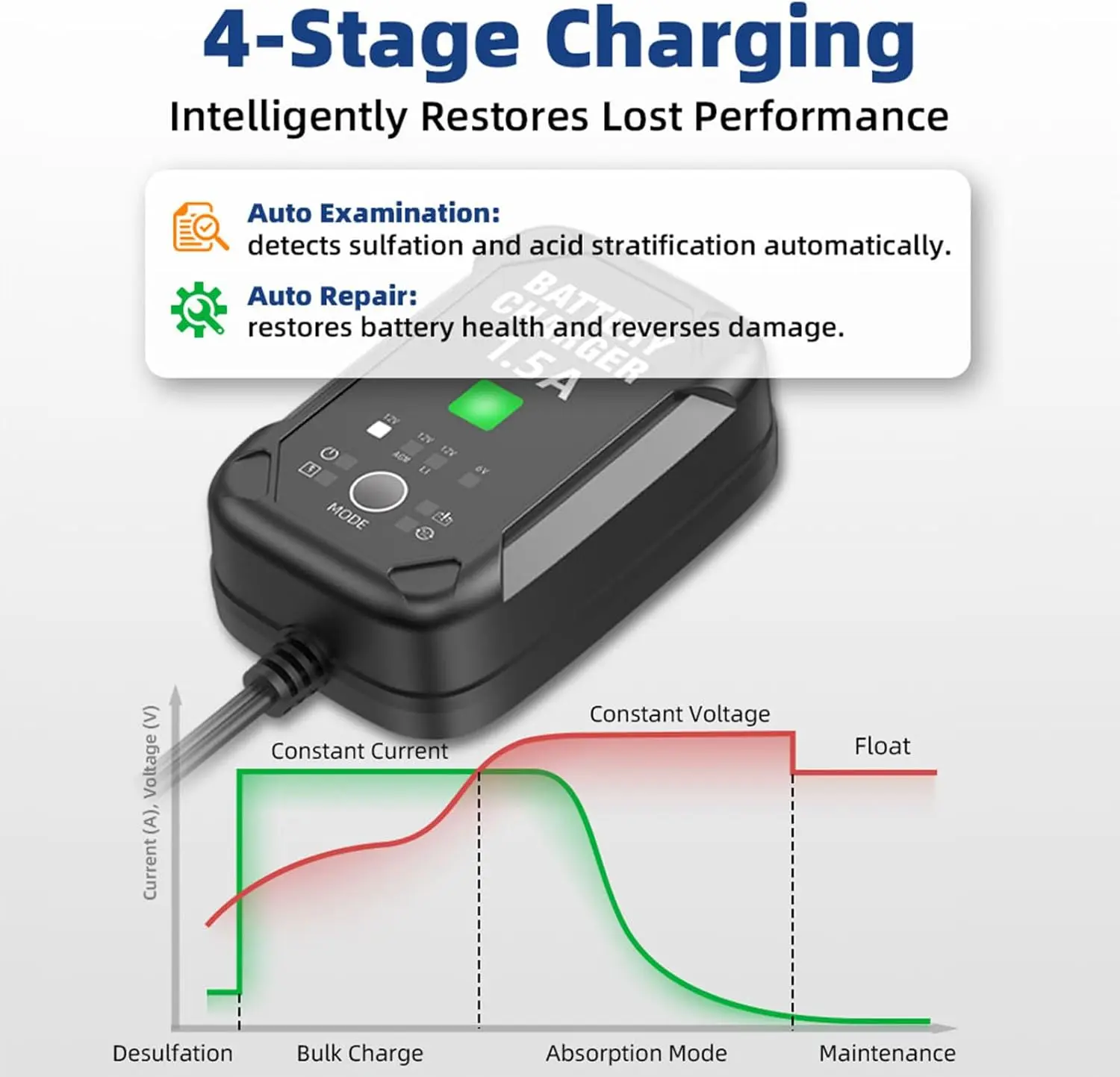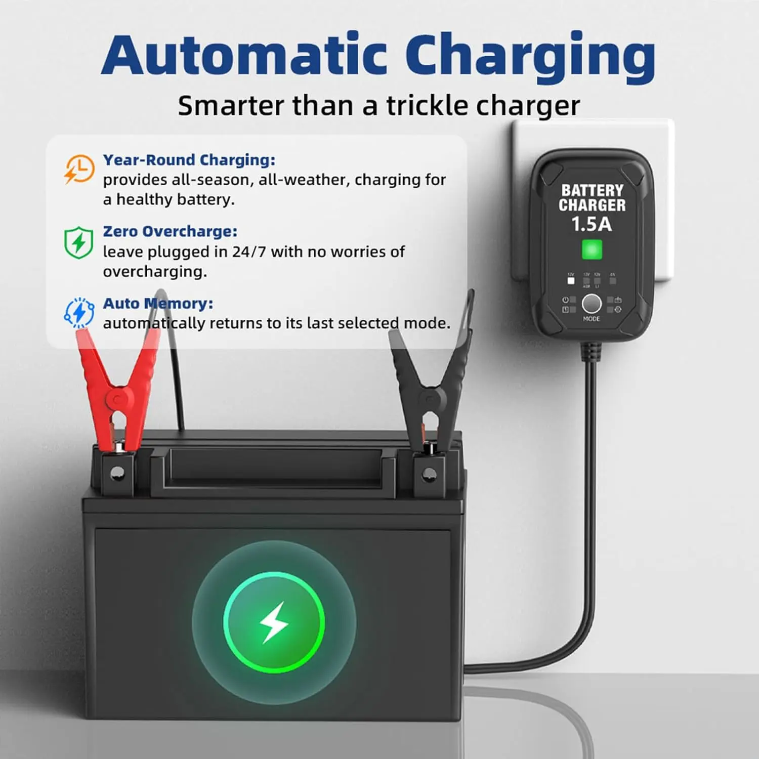 1.5A FASTER CHARGING — Delivers a powerful 1.5A output, 50% faster than standard 1A chargers. One unit works as a car battery charger, battery maintainer, trickle charger, and battery desulfator.
