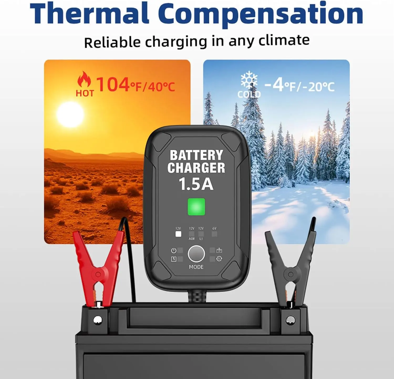 REVIVE DEAD BATTERIES — Advanced Pulse Repair technology detects sulfation and acid stratification. Use Recovery Mode to manually charge dead batteries from 1V, restoring lost performance and extending battery life.SMART THERMAL SENSOR — Features integrated temperature compensation to prevent overcharging in hot weather and undercharging in cold. It automatically adjusts the charge to ensure a 100% full battery in any climate.