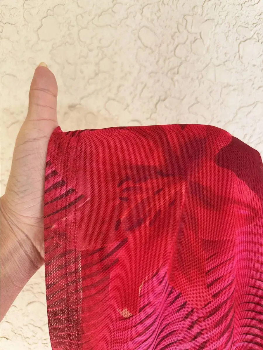 IYUNA Red Mesh Floral Print Metal Buckle Decor Halter Backless A-Line Mini Dress For Women Spring Summer