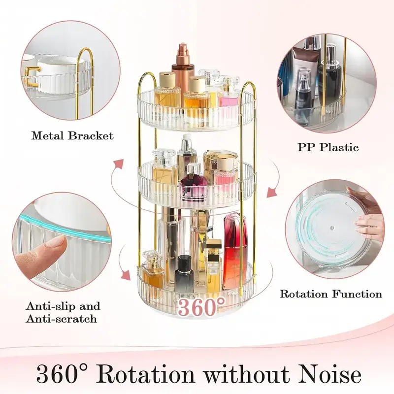 For busy moms with messy countertops & vanities — this 3-tier 360° rotating organizer tidies spices, makeup & toiletries in one stylish space-saving solution!