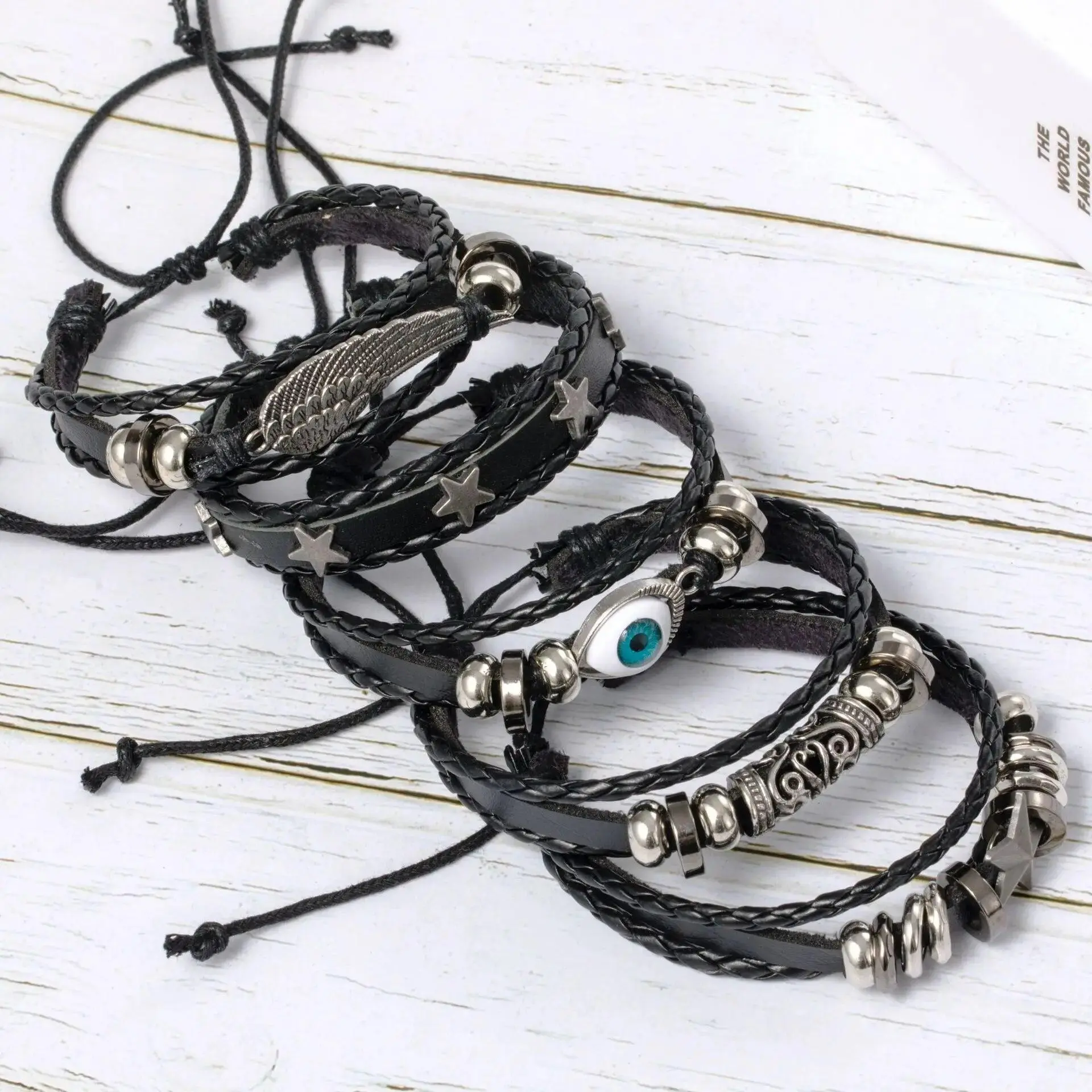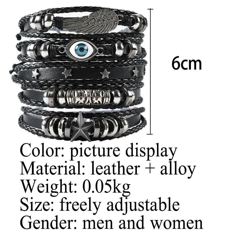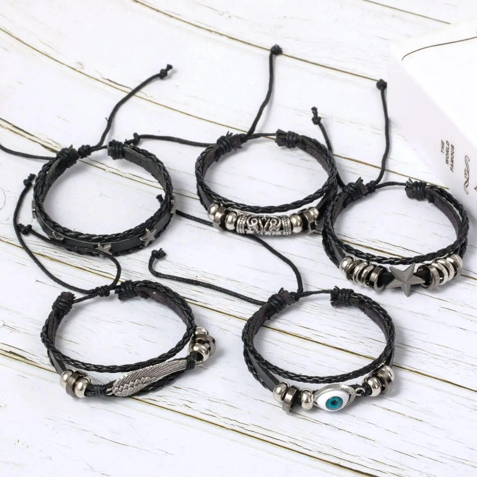 Name:5pcs Evil Eye Wing Star Diy Braided Punk Style Bracelet Set, Featuring Pu Leather And Beads
