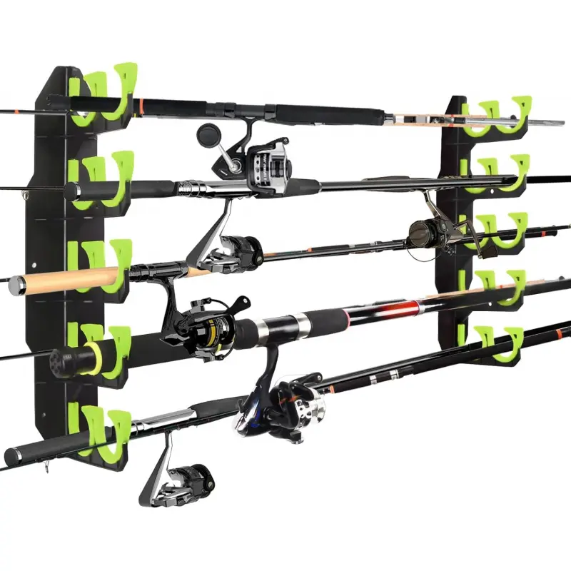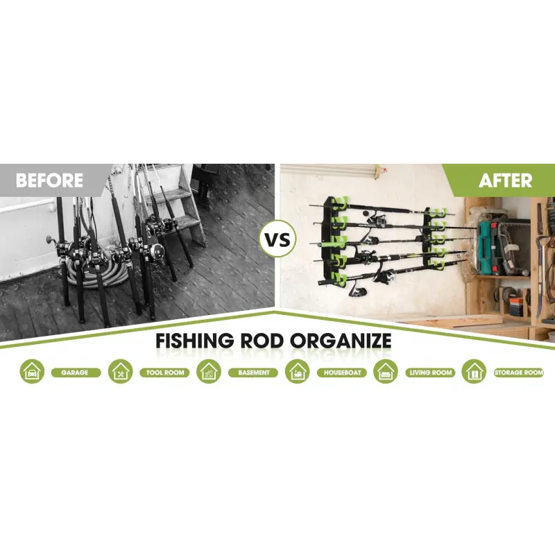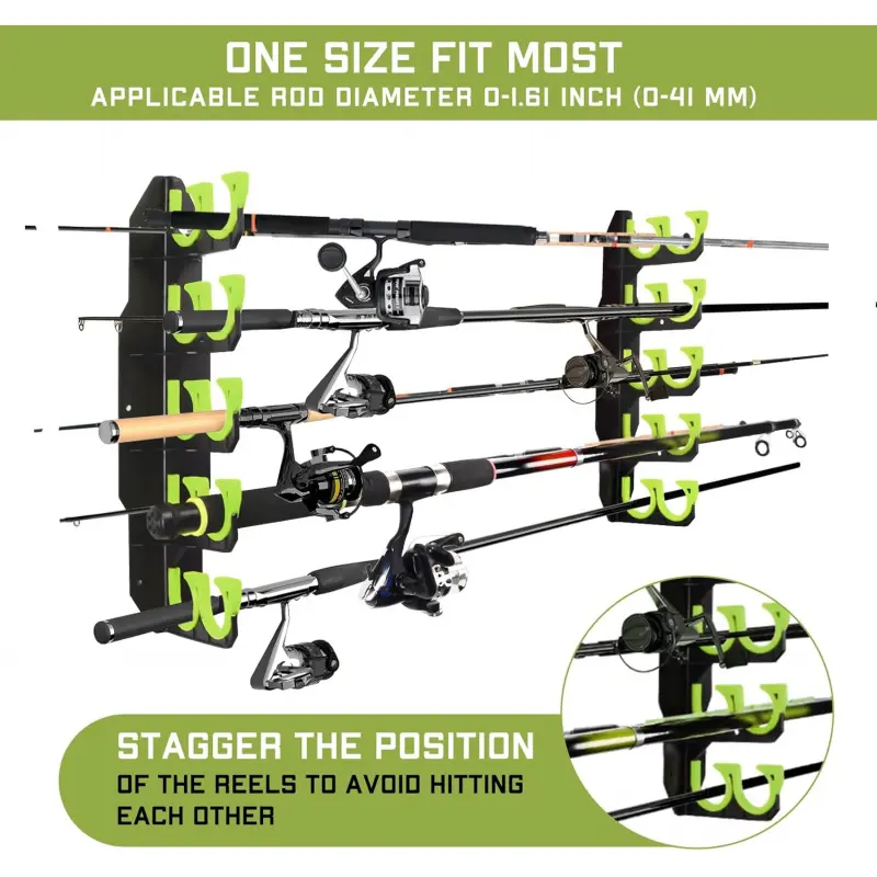 [Innovative Arc Structure Design]This fishing rod holder storage adopts an innovative Inclined Opening combined with Arc Structure Designed which makes easily store or take out your fishing rod.Simply insert the butt of the rod into one of the holes and guide the tip through the opening on the opposite rack for safe storage.Pls alternate rod handles and tips and stagger the position of the reels to avoid hitting each other.