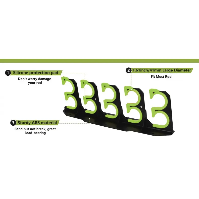 [Sturdy & Durable Material] Fishing pole holders for garage are made of durable ABS which is bend but not break, it features load-bearing and ensure long-lasting performance.The Rod holes and openings are lined with soft silicone protective pad to prevent damage and scratches to your favorite rods.The thickened protective pad design on the contact surface increases the stress-bearing area of the rod and rack, so there is no need to worry about indentations after long-term storage.