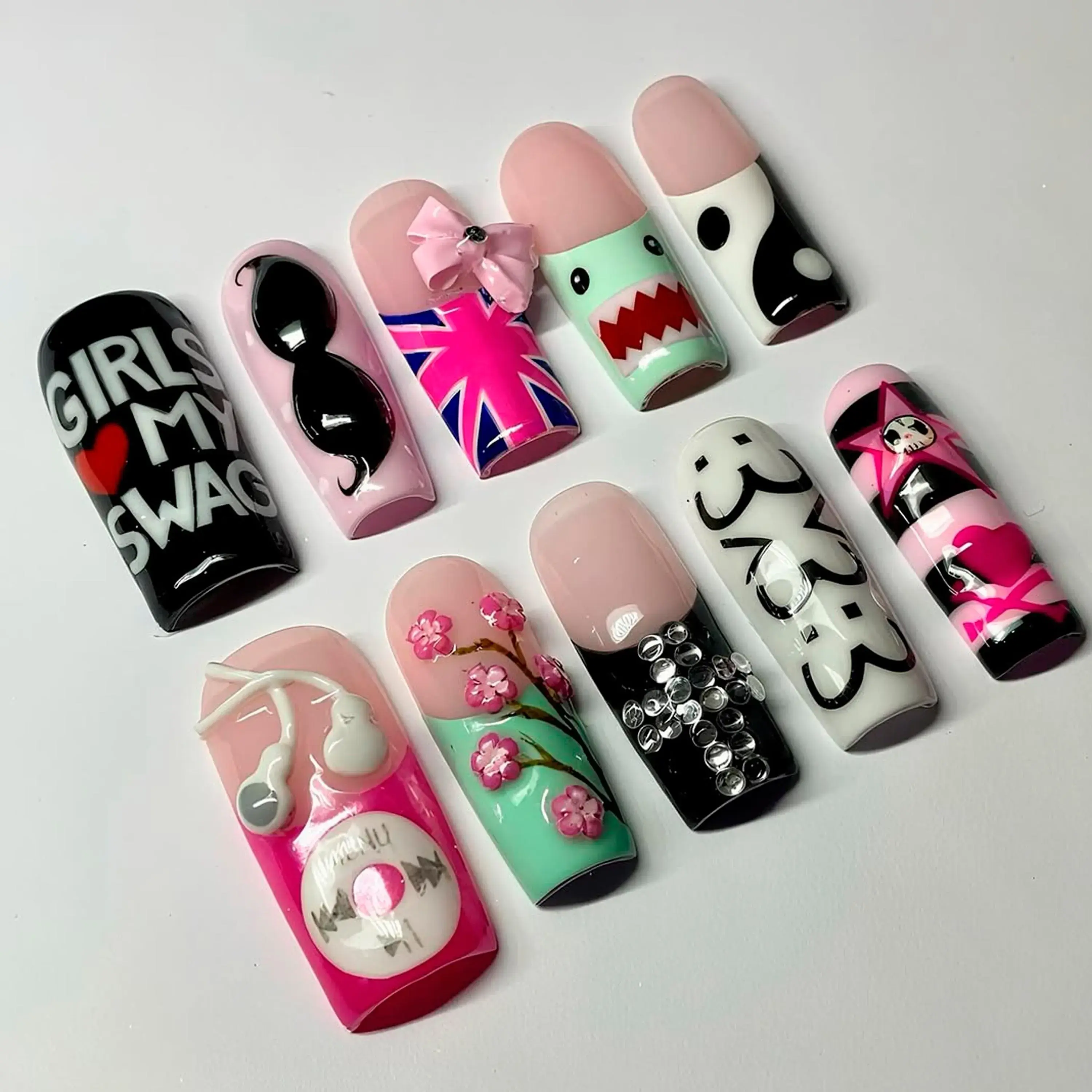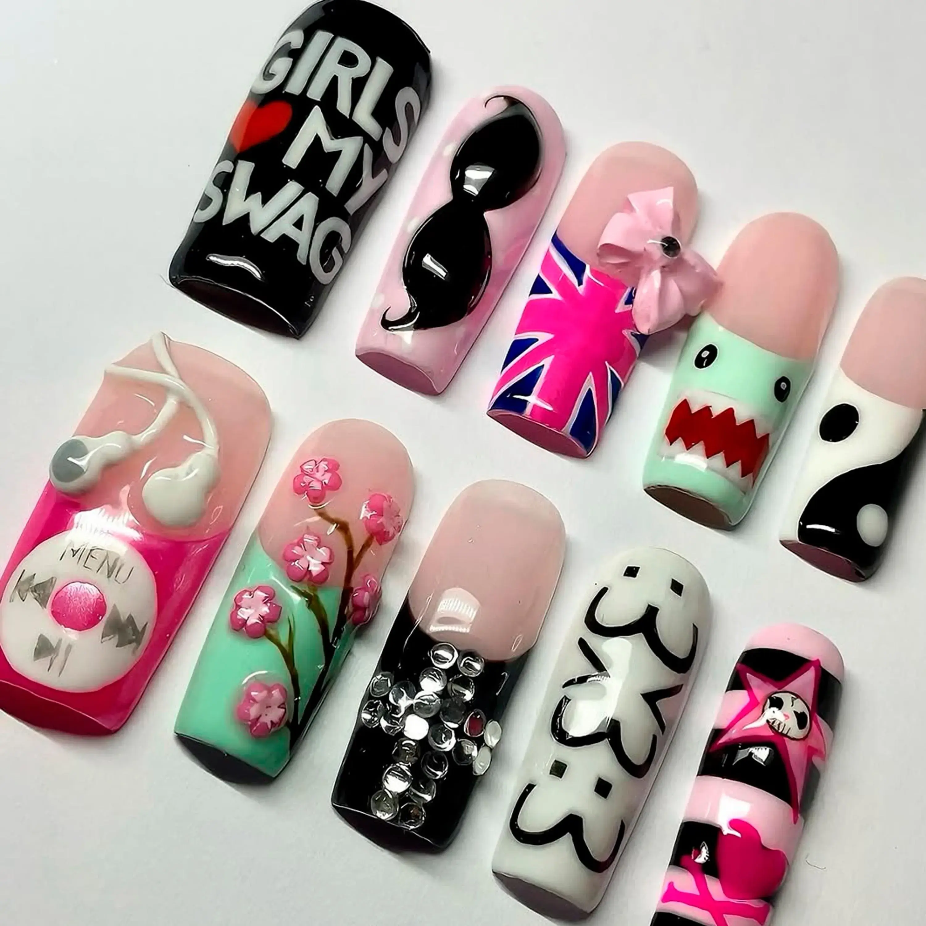 ·Unique Design: These press-on nails feature a Y2K Emo Scene theme, perfect for those who love retro vibes. 🎨