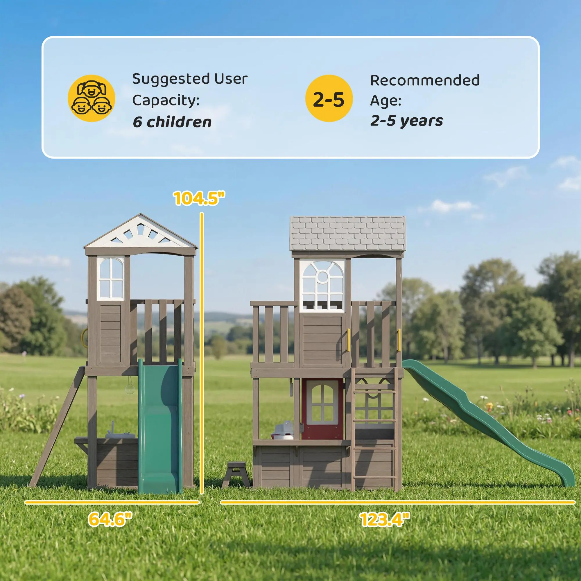 Qaba Two-Story Outdoor Playhouse for Kids, Wooden Kids Playhouse with Slide, Picnic Table & Bench, Play Kitchen, Ladder, Lookout Platform for Age 2+ Backyard Play, Brown