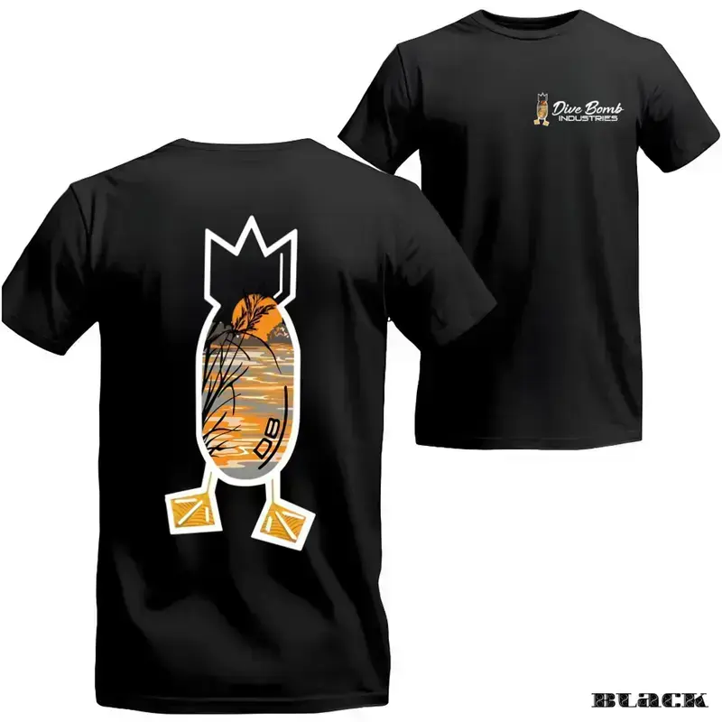 Dive Bomb Industries Hunting T Shirt, Sunset Outdoor Scene Logo Tee, Waterfowl Brand Duck Hunting Graphic, Outdoor Lifestyle Streetwear For Hunters, Unisex Casual Graphic T-Shirts For Men Women Menswear Womenswear