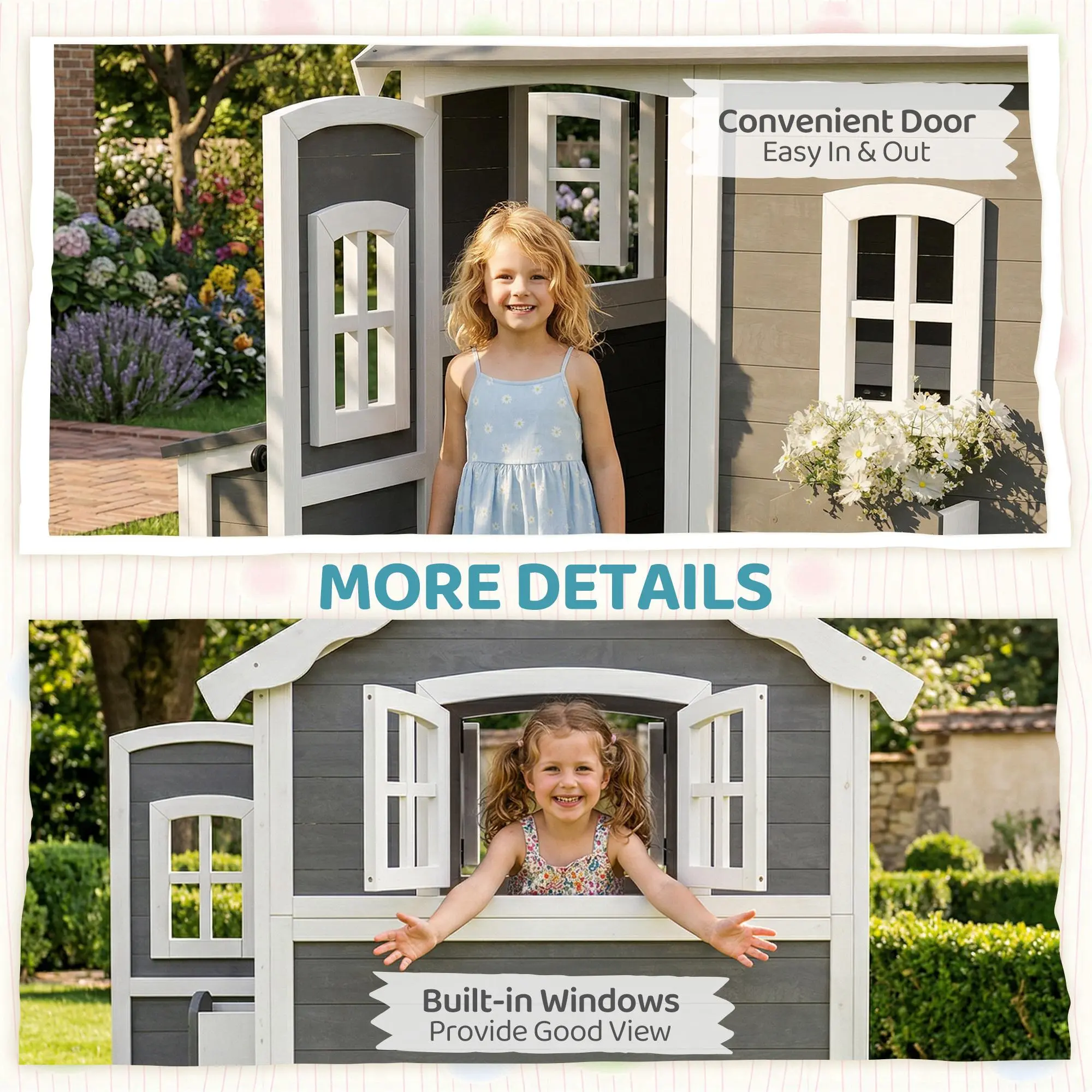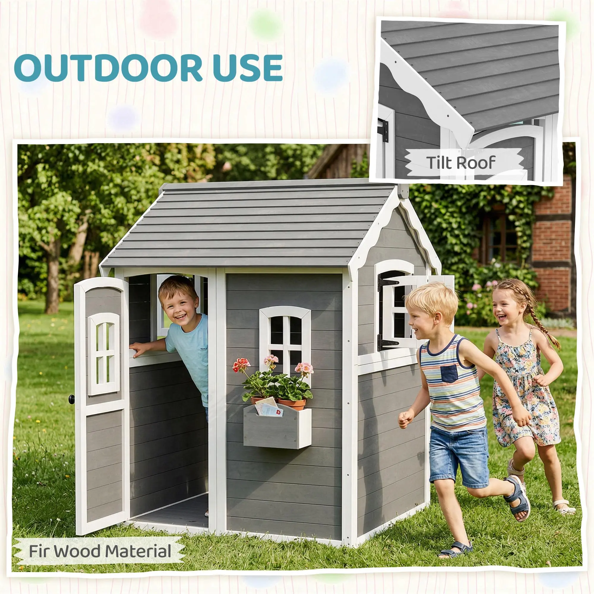 Outsunny Playhouse for Kids, Outdoor Wooden Playhouse with Floor, Door, Windows & Planter Box for 3-8 Year Olds, Backyard, Lawn, Garden, Gray