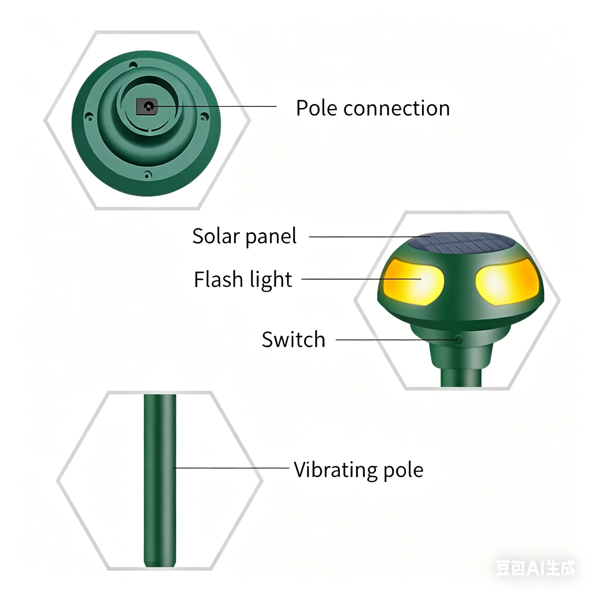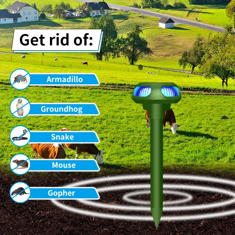 ·【🚫🐁4 Modes Mole Repellent】Brand New Design Mole Repellent not only has motor vibration to repel mole snakes, but also has buzzer sound and light flashing. And there are 4 modes you to choose for other animals, like cats, dogs, squirrels, rats, skunks, raccoons, deer, bird.