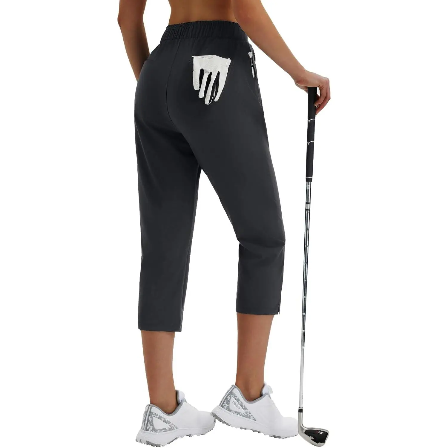 Soft & Stretchy: The fabric of these women's capri pants is lightweight, quick-dry, rated UPF 50+, and non-see through. 4-way stretch for superior mobility and comfort during the golf swing. High Waist & Drawstring: A flattering high‑waist with hidden drawstring hugs the core without digging in. Toss on a belt for a polished business‑casual look or keep it sporty for a morning yoga flow. The faux fly and split hem design make them perfect a sporty look or casual business style. Stay organized with our 4-pocket design: 2 front zip pockets for secure storage of essentials like your phone or cards, and 2 back pockets for convenient access to your golf gloves or balls. Tee Holder:Saying goodbye to pocket rummaging! Our golf capris feature a waist clip to securely hold your golf tee , keeping them handy and enhancing your golf experience. When not in use, it doesn't stand out. Elegant & Versatile Fit: 20 inches long, hitting mid-calf to elongate legs. Fitted and straight-leg for comfort and ease of movement. Perfect for commuting, casual wear, golf , business, travel, commuting, walking and lounge casual wear.
