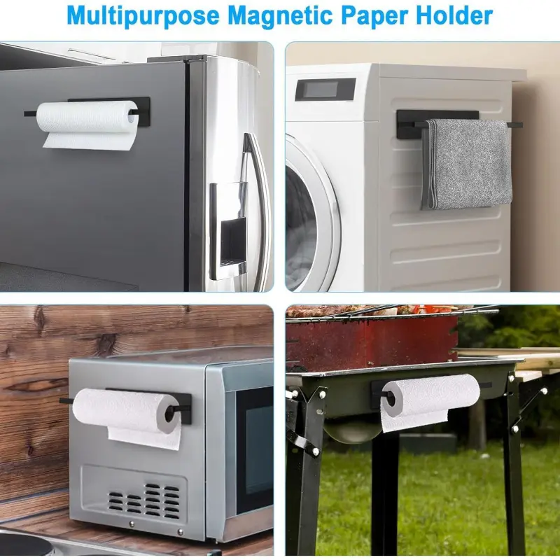 Multifunctional paper towel wall holder: This magnetic under mount paper towel holder is designed with strong magnetic backing for hanging paper towel rolls, household paper towels, bathroom towels, BBQ tools, etc. , on metal surfaces such as the side of the refrigerator, microwave, BBQ grill, washing machine, garage shelves and more. Works as a kitchen organizer, magnetic fridge organizer, kitchen countertop organizer for laundry room organization. A good addition to kitchen essentials for new apartment, travel trailer accessories and cabinet organizers and storage.