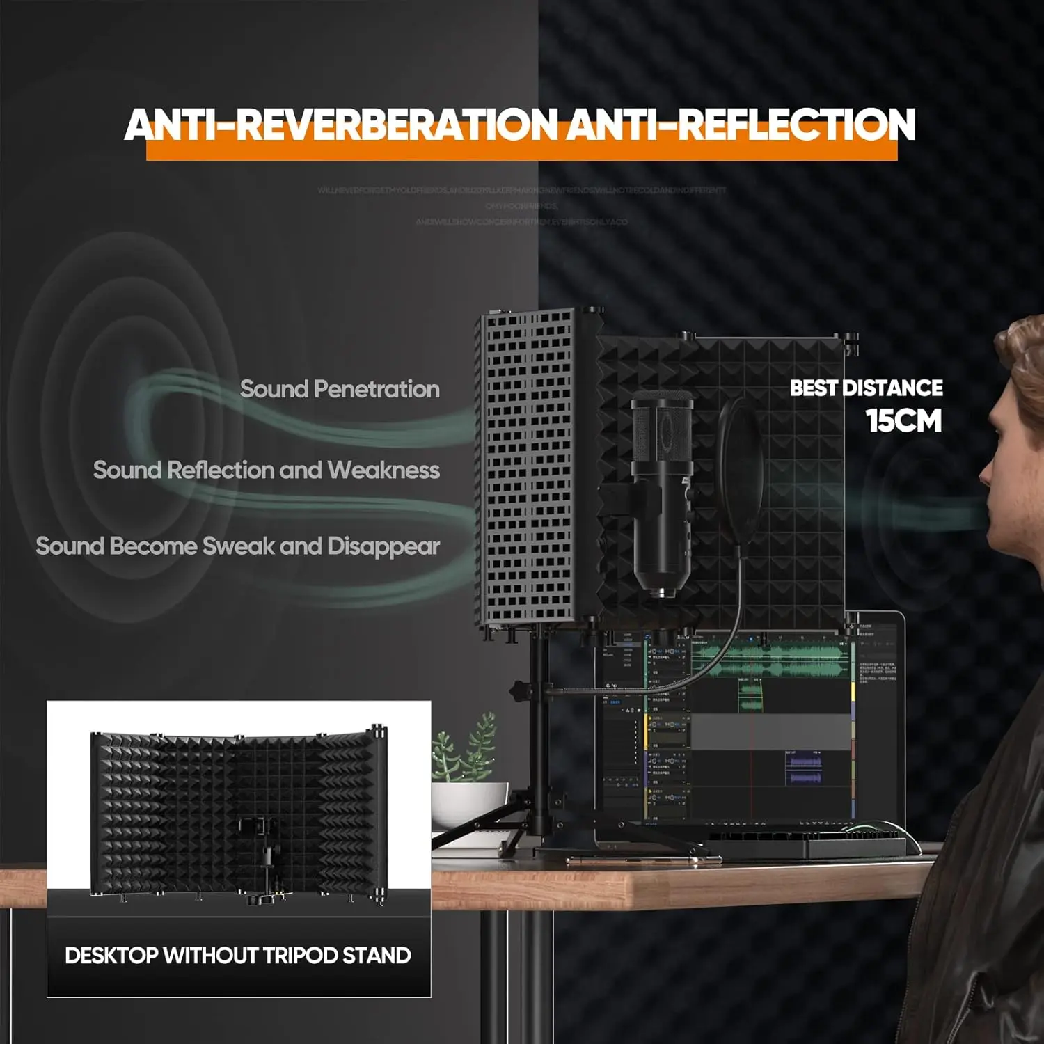 PORTABLE AND FOLDABLE MICROPHONE SHIELD: This 5-panel mic isolation shield is composed of a reflective layer, filter layer, absorbing layer, and high-quality screws, which are durable.The inner layer is composed of high-density absorbent , which can absorb environmental noise and reduce sound reflection when recording sound, providing excellent recording effects.The compact and foldable panel design can be adjusted to suit the angle you want, making it easy to carry.