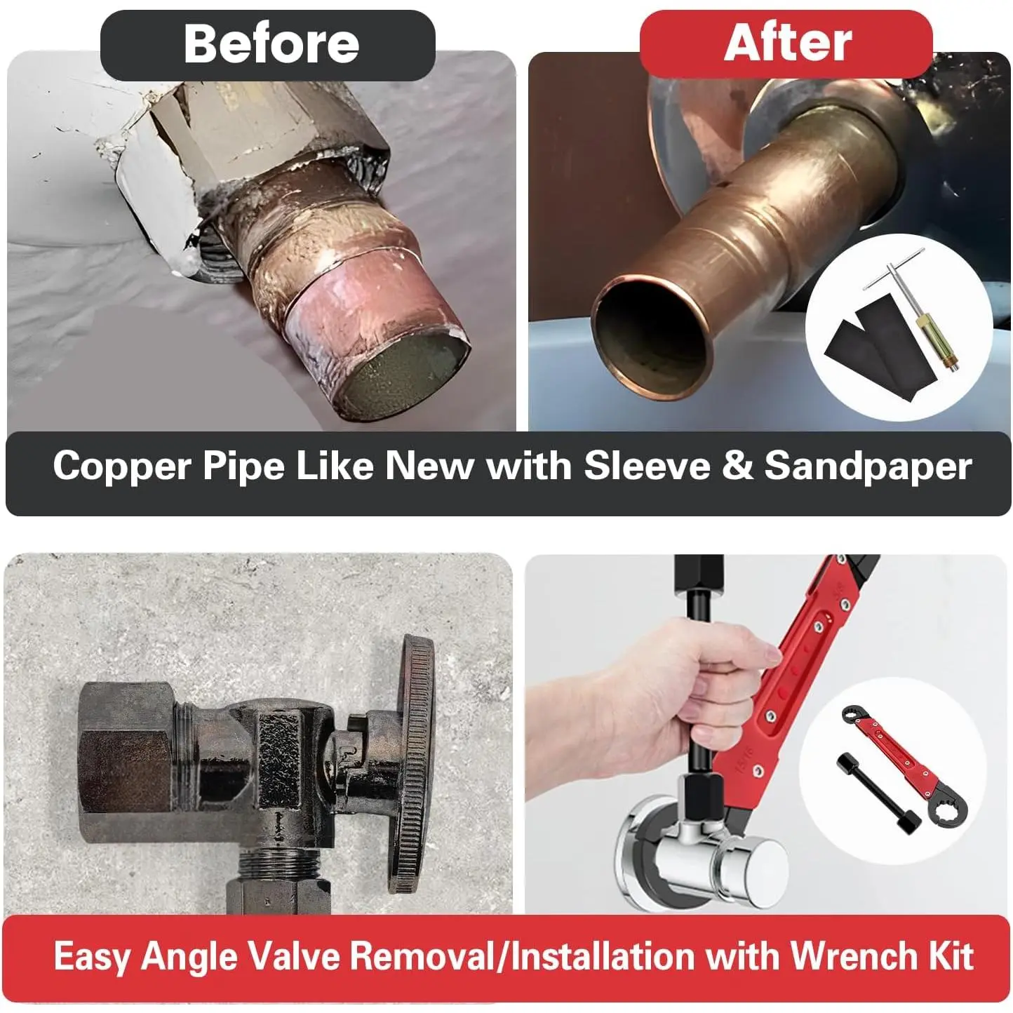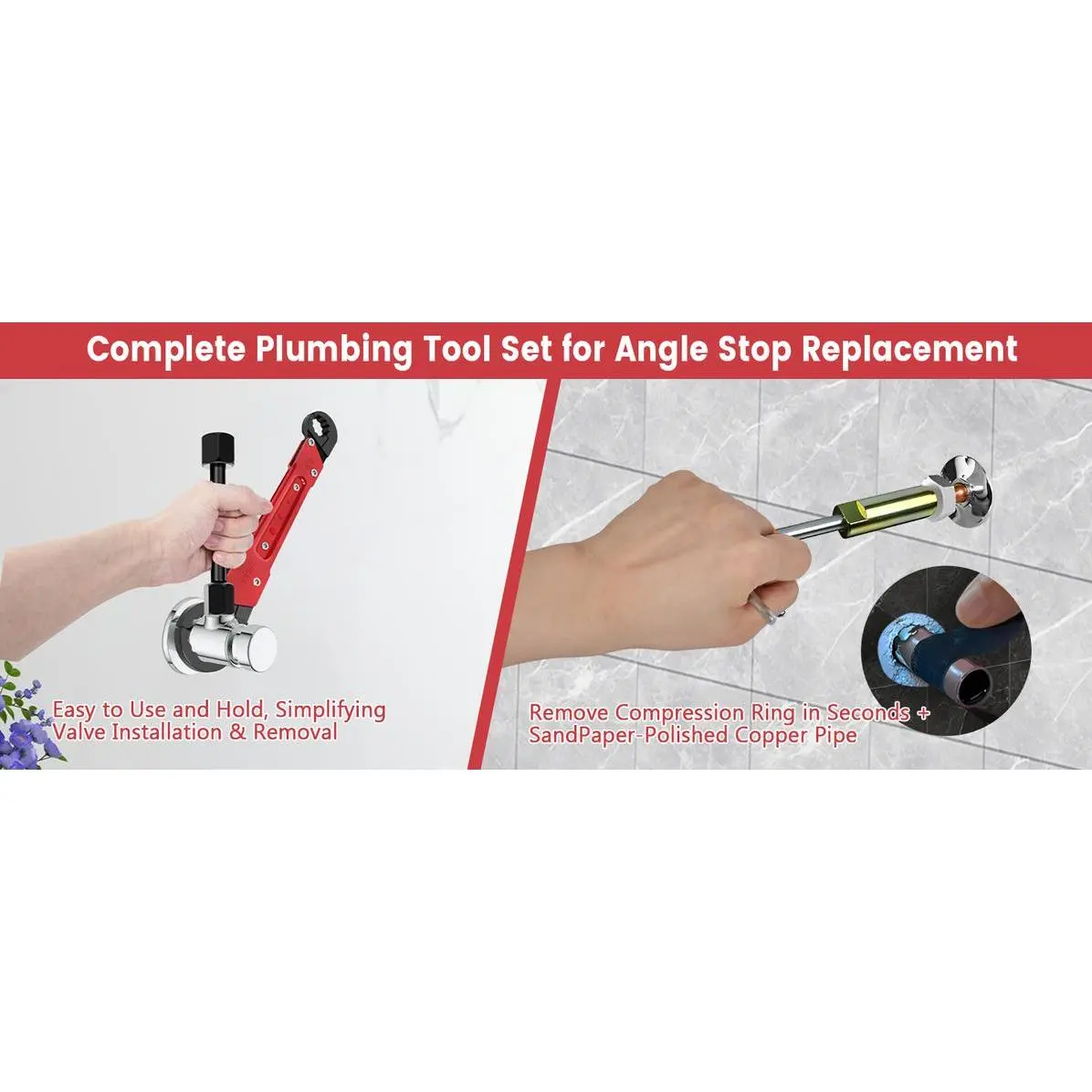 All-in-One Angle Stop Valve Kit: Quickly replace compression angle stops and remove compression rings with step-by-step instructions, designed for DIYers and professional plumbers.No need to buy tools separately-includes an angle stop wrench, compression sleeve puller, sandpaper, and storage bag.
