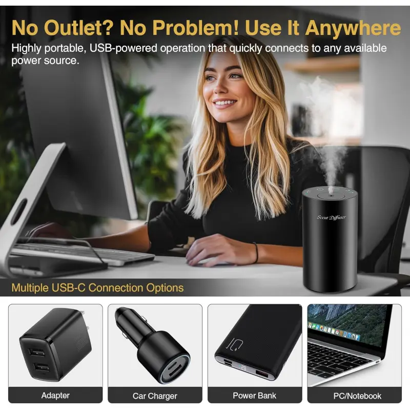 Portable & Versatile for Home & Car Lifestyle: Compact and car-cup holder friendly, this scent diffuser seamlessly transitions between home and car use.Supports multiple power sources, including adapters, car chargers, power banks, and PCs, Whether at home or on the go, it’s your companion for a fresh and fragrant environment.Choose our oil diffuser for a healthier, more fragrant lifestyle